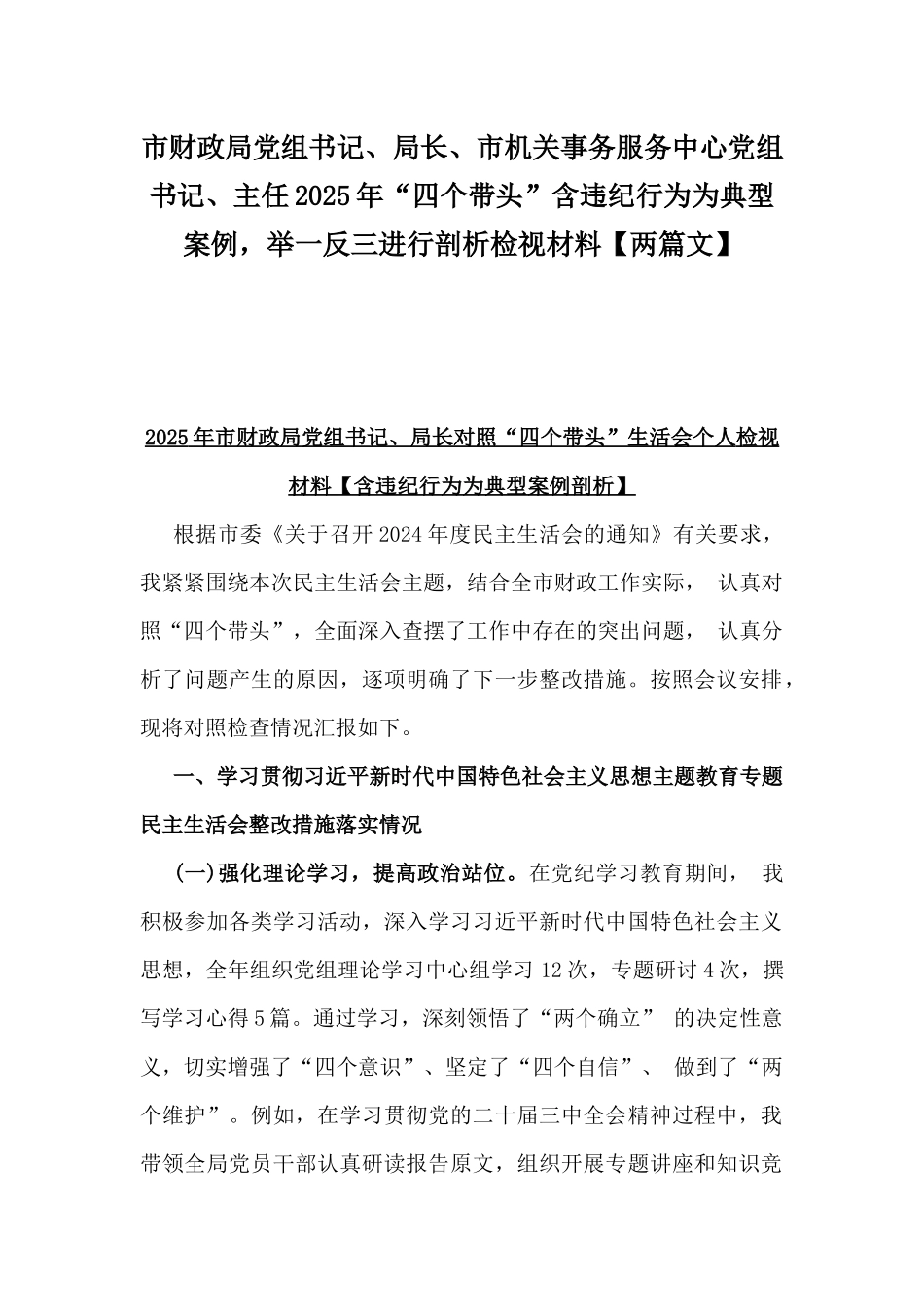 市财政局党组书记、局长、市机关事务服务中心党组书记、主任2025年“四个带头”含违纪行为为典型案例,举一反三进行剖析检视材料【两篇文】2025年市财政局党组书记、局长对照“四个带头”生活会个人检视材料【含违纪行为为典型案例剖析】根据市委《关于召开2024年度民主生活会的通知》有关要求,我紧紧围绕本次民主生活会主题,结合全市财政工作实际,认真对照“四个带头”,全面深入查摆了工作中存在的突出问题,认真分析了问题产生的原因,逐项明确了下一步整改措施。按照会议安排,现将对照检查情况汇报如下。一、学习贯彻习近平新时代中国特色社会主义思想主题教育专题民主生活会整改措施落实情况(一)强化理论学习,提高政治站位。在党纪学习教育期间,我积极参加各类学习活动,深入学习习近平新时代中国特色社会主义思想,全年组织党组理论学习中心组学习12次,专题研讨4次,撰写学习心得5篇。通过学习,深刻领悟了“两个确立”的决定性意义,切实增强了“四个意识”、坚定了“四个自信”、做到了“两个维护”。例如,在学习贯彻党的二十届三中全会精神过程中,我带领全局党员干部认真研读报告原文,组织开展专题讲座和知识竞赛,全局党员干部的政治理论水平得到了显著提高。(二)切实履行职责,推动财政工作。紧紧围绕XX市经济社会发展大局,积极发挥财政职能作用。在财政收支管理方面,2024年全市一般公共预算收入完成XX亿元,同比增长XX%;一般公共预算支出完成XX亿元,同比增长XX%,为全市经济社会发展提供了有力的资金保障。例如,加大对重点项目的资金投入,安排XX亿元支持交通基础设施建设,有效改善了全市的交通条件。(三)加强作风建设,提升服务水平。始终坚持以人民为中心的发展思想,积极落实中央八项规定及其实施细则精神,切实改进工作作风。在优化营商环境方面,简化财政审批流程,将审批时间缩短了XX%,为企业提供了更加便捷的服务。例如,推行“互联网+政务服务”,实现了财政业务网上办理,企业和群众办事更加方便快捷。二、存在的突出问题(一)在带头严守政治纪律和政治规矩,维护党的团结统一方面。一是政治理论学习深度不够。虽然积极参加各类政治学习活动,但在学习过程中,存在浅尝辄止的情况,对习近平新时代中国特色社会主义思想的精髓领会不够深刻。例如,在学习党的最新政策文件时,有时只是满足于通读一遍,没有深入思考和研究其内涵和实质,导致在实际工作中运用理论指导实践的能力不足。二是政治敏锐性有待提高。在面对复杂多变的国际国内形势和网络上的一些错误言论时,有时未能及时准确地识别和抵制,缺乏应有的政治敏锐性和政治鉴别力。比如,在社交媒体上出现一些对财政政策的错误解读时,没有第一时间进行纠正和引导,造成了一定的不良影响。三是贯彻落实上级决策部署不够坚决。在工作中有时存在打折扣、搞变通的情况,未能完全按照上级的要求和标准执行到位。例如,在推进某项财政改革任务时,由于担心改革可能会带来一些暂时的困难和阻力,对改革方案进行了部分调整,导致改革效果没有达到预期目标。四是党内政治生活不够严肃。在参加党内政治生活时,有时存在形式主义的问题,批评与自我批评不够深刻,辣味不足。例如,在民主生活会中,对其他同志的批评意见多是浮于表面,没有触及到问题的实质和根源,对自身存在的问题也没有进行深刻的自我批评。(二)在带头增强党性、严守纪律、砥砺作风方面。一是党性修养不够坚定。在面对各种利益诱惑和复杂环境时,有时会出现思想动摇,党性原则不够坚定。例如,在处理一些涉及财政资金分配的问题时,受到人情关系的影响,没有完全按照规定和原则进行处理,损害了财政工作的公正性和严肃性。二是纪律执行不够严格。虽然对党纪国法和财政纪律有一定的认识,但在实际工作中,有时存在侥幸心理,对一些轻微的违纪行为没有及时进行制止和纠正。比如,个别科室在报销费用时存在超标准报销的情况,没有严格审核把关,导致出现违规报销问题。三是工作作风不够扎实。在工作中有时存在浮躁情绪和急功近利的思想,对工作的落实情况缺乏跟踪问效和督促检查。例如,在推进某项财政资金监管工作时,只是制定了工作方...