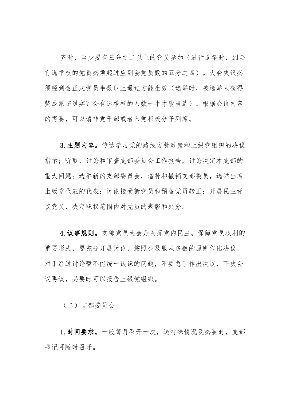 XX党支部“三会一课”、主题党日活动开展要求党支部是党的最基层组织,是党的全部工作和战斗力的基础。加强党支部规范化建设,是落实全面从严治党要求,坚持大抓基层、严抓基层的重要举措。开展党支部规范化建设,对于推动全面从严治党,筑牢党的最基层组织,进一步增强党支部凝聚力、创造力、战斗力,具有重要意义。“三会一课”是指定期召开支部委员会、党小组会、支部党员大会、按时上好党课。“三会一课”制度是党的组织生活的基本制度,是党的基层支部应该长期坚持的重要制度,也是健全党的组织生活,严格党员管理,加强党员教育的重要制度,是我党经过长期实践证明的一种行之有效的党组织生活制度。(一)支部党员大会1.时间要求。一般每季度召开一次,根据需要可以适应增加活动次数。2.参会人员。会议由支部委员会召集,党支部书记主持,议题由支部委员会根据上级党工委的指示和工作需要确定,会议内容由支部委员会在会前通知党员。党员大会一般要全体党员参加,人数到不齐时,至少要有三分之二以上的党员参加(进行选举时,到会有选举权的党员必须超过应到会党员数的五分之四)。大会决议必须经到会正式党员半数以上通过方能生效(选举时,被选举人获得赞成票超过实到会有选举权的人数一半才能当选)。根据会议内容的需要,可以请非党干部或者入党积极分子列席。3.主题内容。传达学习党的路线方针政策和上级党组织的决议指示;听取、讨论和审查支部委员会工作报告,讨论决定本支部的重大问题;选举新的支部委员会,增补和撤销支部委员,选举出席上级党代表的代表;讨论接受新党员和预备党员转正;开展民主评议党员,决定职权范围内对党员的表彰和处分。4.议事规则。支部党员大会是发挥党内民主。保障党员权利的重要形式,要充分开展讨论,按照少数服从多数的原则作出决议,对于经过讨论暂不能统一认识的问题,不要急于作出决议,下次会议再议,必要时可以报告上级党组织。(二)支部委员会1.时间要求。一般每月召开一次,遇特殊情况及必要时,支部书记可随时召开。2.参会人员。半数以上的支部委员参加方可进行,必要时也可召开支委扩大会议,吸收党小组长和有关党员干部参加。3.主题内容。传达学习党的路线方针政策;研究贯彻上级党组织和支部党员大会的决议和意见;讨论制定年度支部工作计划和工作总结;研究讨论支部的重大问题,并提出意见;研究党的建设和党员教育管理方面的问题;研究入党积极分子的培养教育和发展新党员方面的问题。讨论研究工、青、妇等群众组织工作方面的问题;研究开展民主评议党员的有关事项,提出对党员的奖励和处分意见。4.议事规则。支部委员会研究讨论有关问题,既要防止在重大问题上个人意志代替集体决定的现象,也要防止事无巨细把应由个人分工处理的事都提交集体讨论的现象。支部委员会要遵守规定的程序,事前让委员知晓会议议题,有所准备、委员之间要充分沟通,达成共识。会议决议的执行情况要注意检查督促,决议必须有应到会半数以上的支部委员赞同方可有效。(三)党小组会1.时间要求。一般每月召开一至两次,如支部有特殊任务,次数可增加,也可推迟召开。2.参会人员。党小组全体党员参加,会议由党小组组长主持。3.主题内容。组织党员学习;围绕党的中心工作和党支部的近期工作,结合本小组实际情况确定,每次解决一两个问题;研究如何贯彻执行支部决议和各项工作任务;党员汇报思想和工作情况;开展批评和自我批评;研究发展党员培养教育工作;讨论对党员的处分等党务工作事项。4.议事规则。会前要与党支部沟通,确定内容方法,通知党员做好准备;会中要抓好中心内容讨论,力求统一思想,明确责任。(四)党课1.时间要求。每季度不少于1课。2.参会人员。全体党员和入党积极分子。3.主题内容。根据不同时期的形势和任务,结合实际和党员的思想状况有针对性的进行。党课内容一般为学习党的基本理论、基本政策、基本知识、科技文化知识,以及结合当前形势,对党员进行党章党纪党规教育、党的先进性和纯洁性教育、党的群众路线教育、党的形势和任务教育等。4.授课要求。授课人可由本单位党组织负责人承担,也可请上级党组织负责人或者...