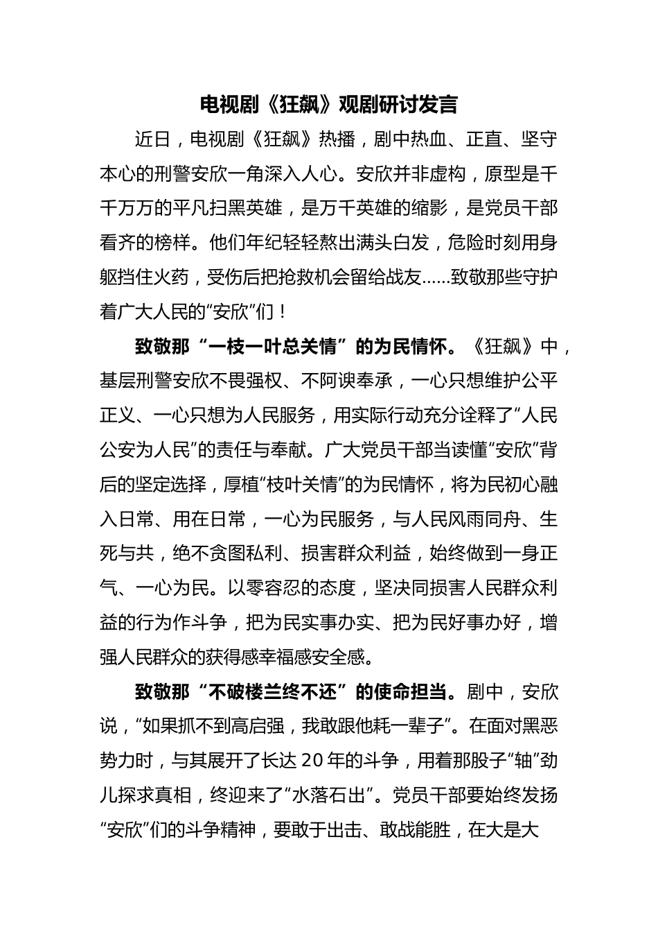电视剧《狂飙》观剧研讨发言近日,电视剧《狂飙》热播,剧中热血、正直、坚守本心的刑警安欣一角深入人心。安欣并非虚构,原型是千千万万的平凡扫黑英雄,是万千英雄的缩影,是党员干部看齐的榜样。他们年纪轻轻熬出满头白发,危险时刻用身躯挡住火药,受伤后把抢救机会留给战友……致敬那些守护着广大人民的“安欣”们!致敬那“一枝一叶总关情”的为民情怀。《狂飙》中,基层刑警安欣不畏强权、不阿谀奉承,一心只想维护公平正义、一心只想为人民服务,用实际行动充分诠释了“人民公安为人民”的责任与奉献。广大党员干部当读懂“安欣”背后的坚定选择,厚植“枝叶关情”的为民情怀,将为民初心融入日常、用在日常,一心为民服务,与人民风雨同舟、生死与共,绝不贪图私利、损害群众利益,始终做到一身正气、一心为民。以零容忍的态度,坚决同损害人民群众利益的行为作斗争,把为民实事办实、把为民好事办好,增强人民群众的获得感幸福感安全感。致敬那“不破楼兰终不还”的使命担当。剧中,安欣说,“如果抓不到高启强,我敢跟他耗一辈子”。在面对黑恶势力时,与其展开了长达20年的斗争,用着那股子“轴”劲儿探求真相,终迎来了“水落石出”。党员干部要始终发扬“安欣”们的斗争精神,要敢于出击、敢战能胜,在大是大非面前敢于亮剑,在矛盾冲突面前敢于迎难而上,在危机困难面前敢于挺身而出,在歪风邪气面前敢于坚决斗争。要时刻牢记群众利益无小事,只有恪守职责,迎难而上,才能用硬脊梁、宽肩膀担当起时代重任,用实际行动践行初心和使命。致敬那“只留清气满乾坤”的高尚品行。在剧中,安欣将“逢年过节收瓶酒后按市场价格给对方发红包”都如实记录了下来,没有丝毫隐瞒。而赵立冬、龚开疆等个别党员干部丧失纪法底线,奢靡享乐、贪赃枉法,甚至与黑恶分子沆瀣一气,严重损害人民群众利益。“安欣”正是党员干部当追逐的“榜样力量”、汲取的“精神灯塔”。当扣好廉洁从政的“第一粒扣子”,时刻保持清醒的头脑,绷紧廉洁自律的弦,早敲“警示钟”,再念“紧箍咒”,自觉做到慎始、慎终,慎独、慎微,自觉守住“底线”,不越“红线”,不碰“高压线”,坦坦荡荡做事、干干净净做人。