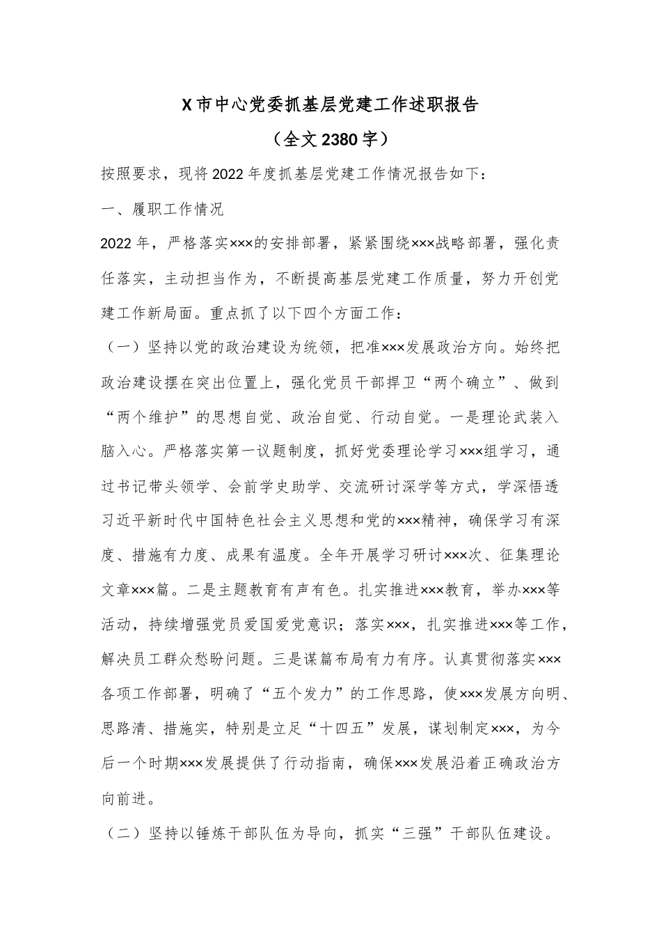 X市中心党委抓基层党建工作述职报告(全文2380字)按照要求,现将2022年度抓基层党建工作情况报告如下:一、履职工作情况2022年,严格落实×××的安排部署,紧紧围绕×××战略部署,强化责任落实,主动担当作为,不断提高基层党建工作质量,努力开创党建工作新局面。重点抓了以下四个方面工作:(一)坚持以党的政治建设为统领,把准×××发展政治方向。始终把政治建设摆在突出位置上,强化党员干部捍卫“两个确立”、做到“两个维护”的思想自觉、政治自觉、行动自觉。一是理论武装入脑入心。严格落实第一议题制度,抓好党委理论学习×××组学习,通过书记带头领学、会前学史助学、交流研讨深学等方式,学深悟透习近平新时代中国特色社会主义思想和党的×××精神,确保学习有深度、措施有力度、成果有温度。全年开展学习研讨×××次、征集理论文章×××篇。二是主题教育有声有色。扎实推进×××教育,举办×××等活动,持续增强党员爱国爱党意识;落实×××,扎实推进×××等工作,解决员工群众愁盼问题。三是谋篇布局有力有序。认真贯彻落实×××各项工作部署,明确了“五个发力”的工作思路,使×××发展方向明、思路清、措施实,特别是立足“十四五”发展,谋划制定×××,为今后一个时期×××发展提供了行动指南,确保×××发展沿着正确政治方向前进。(二)坚持以锤炼干部队伍为导向,抓实“三强”干部队伍建设。坚持党管干部、党管人才原则,完善干部“选育管用”机制,着力打造政治坚强、本领高强、意志顽强的高素质专业化干部队伍。一是抓好领导班子建设。严格执行民主集中制,认真落实“三重一大”决策制度,厘清议事程序,确保重要决策科学民主。全年组织召开党委会×××次,集体研究讨论重要事项×××项;严肃党内政治生活,过好双重组织生活,持续提升班子成员的政治素养;班子成员定期深入党建三联责任示范点调研指导工作,履行好“一岗双责”。二是优化干部队伍结构。坚持“德才兼备、业绩为先”,全年分×××批次调整基层领导人员×××人,逐步形成了老中青干部梯次配备的队伍结构;加强后备干部队伍建设,建立后备干部库,实施动态管理,拓宽选人用人空间。三是加大教育培训力度。坚持分类施策、因材施教,针对管理人员,举办管理提升和青年英才培训班,提升干部综合能力;针对专业技术人员,搭建线上线下专业交流、学术学习等平台,培训各类技术人才×××余人次。(三)坚持以打牢组织基础为重点,提升基层党建工作质量。把抓实基本组织、基本队伍、基本制度建设作为固本之策。一是夯实基本组织。结合×××实际,成立党总支×××个,同步成立基层党支部×××个,配齐配强党支部班子,推动基层党组织发挥战斗堡垒作用,组织健全率100%。二是建好基本队伍。举办党务工作培训班,重点学习了党内规章制度和党务工作实务知识,提升党务干部履职能力;加强党员学习教育管理,利用“三会一课”、线上培训、×××APP等方式,引导党员注重自身建设,加强学习交流,发挥先锋模范作用。三是完善基本制度。制定×××党委议事规则,为科学民主谋划重要事项提供参考依据;规范党组织工作经费审批程序,确保党组织活动依法合规;归纳梳理发展党员、党组织换届选举等流程×××项,使党支部换届选举制度化、规范化,党组织政治功能更加凸显。(四)坚持以全面从严治党为主线,营造风清气正发展环境。把全面从严治党作为助力×××发展的坚强保障。一是压实廉洁责任。签订党风廉政建设责任书×××份,制定领导干部履行党风廉政建设“一岗双责”《工作手册》×××份。二是优化监督方式。建立“常态+专项”监督模式,对×××等×××个方面的工作进行监督,有效规避各类问题。三是注重廉洁风险防范。组织开展廉洁风险排查,排查工作流程×××个、工作岗位×××个,实现重要流程、关键岗位廉洁风险防控全覆盖。四是抓实意识形态工作。把意识形态工作纳入党委会议议程、党建工作考核,强化宣贯教育,抓好舆情管控,定期开展敏感信息清查工作,坚决肃清流毒影响,牢牢把握意识形态工作主动权。五是抓好巡察问题整改工作。针对巡察组反馈的问题,召开...