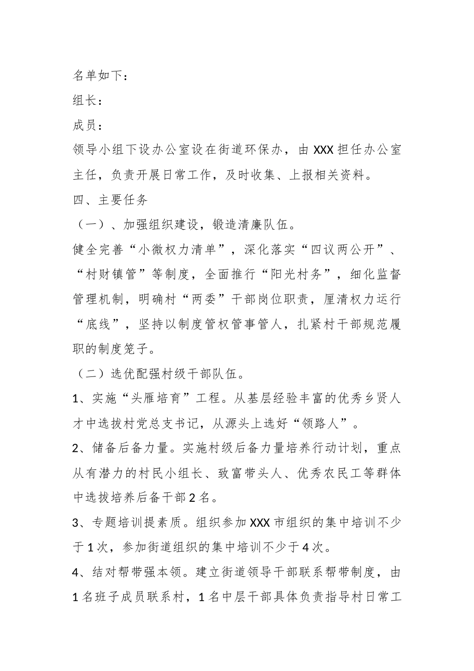 有关于某街道清廉乡村建设实施方案为持续深化基层党风廉政建设,不断探索基层治理和基层监督的新方法、新经验,持续完善和健全基层监督体系,特制定本方案。一、工作目标紧紧围绕推进治理体系和治理能力现代化的总目标,始终抓住党员干部这个关键,坚持面向基层群众这一主体,着力扭住制度建设这条主线,构建党建引领下的“四治”融合的清廉村居治理体系。“十四五”时期,清廉村居建设全面推进并基本成型,基层党组织管党治党机制更加健全农村基层党员干部敬畏意识、廉洁意识明显增强,农村“三资”管理、基层权力运行制约监督机制更加有效,全面从严治党在农村基层得到全面延伸。二、工作任务11月底前,XXX村严格按照工作方案,全面推进,全面攻坚,基本完成年度建设任务。12月底前,逐一对照清廉乡村建设标准,全面梳理,查漏补缺,总结经验,激励典型完成自查申报,迎接市级验收。三、组织领导为切实完成2023年清廉乡村建设任务,经街道党工委、办事处研究同意,成立太和街道清廉乡村建设领导小组名单,名单如下:组长:成员:领导小组下设办公室设在街道环保办,由XXX担任办公室主任,负责开展日常工作,及时收集、上报相关资料。四、主要任务(一)、加强组织建设,锻造清廉队伍。健全完善“小微权力清单”,深化落实“四议两公开”、“村财镇管”等制度,全面推行“阳光村务”,细化监督管理机制,明确村“两委”干部岗位职责,厘清权力运行“底线”,坚持以制度管权管事管人,扎紧村干部规范履职的制度笼子。(二)选优配强村级干部队伍。1、实施“头雁培育”工程。从基层经验丰富的优秀乡贤人才中选拔村党总支书记,从源头上选好“领路人”。2、储备后备力量。实施村级后备力量培养行动计划,重点从有潜力的村民小组长、致富带头人、优秀农民工等群体中选拔培养后备干部2名。3、专题培训提素质。组织参加XXX市组织的集中培训不少于1次,参加街道组织的集中培训不少于4次。4、结对帮带强本领。建立街道领导干部联系帮带制度,由1名班子成员联系村,1名中层干部具体负责指导村日常工作。(三)、完善体制机制,提升民主决策1、完善村级民主决策机制。定期召开居民会议和居民代表会,充分发挥村民监督小组作用。2、及时修订完善村规民约。新增抵制高价彩礼、提倡喜事新办、红白喜事不铺张浪费等内容。3、全面落实“四议两公开”。进一步完善“四议两公开”工作程序,建好台账,做好工作记录。全面落实“四议两公开”决策制度,及时公开“四议两公开”决策的内容及实施结果。4、加强“三资”管理。规范实行“三资”(资产、资金、资源)账单式管理,严格按照财务管理要求,建立联签机制,严格实行“村财镇管”,完善村级会计委托代理制,落实农村集体资产年度清查制度和定期报告制度。(四)规范村级事项,打造阳光村务1、规范村级“小微权利”。制定村级“小微权力”清单,明确村干部管理权限和职能职责,在“重大决策、日常管理、便民服务”等三类事项上规范行使权力。建立村干部廉洁履职负面清单,明确廉洁履职行为规范;完善村干部个人廉洁档案;让村干部作出廉洁履职承诺。2、规范“三务”公开制度。在村内设置居务公开栏,规范宣传栏布局、规范公开文档形式、规范公开内容、公示时间及相关程序。3、开展“书记晒账本”活动。通过7个清单,5种公开形式,规范书记晒账本活动,进一步保障群众对村务工作的知情权、参与权和监督权。7个清单:即村级资金账单、集体资产账单、集体资源账单、项目建设清单、群众民意清单、享受救助类资金的清单享受补贴、补助类资金的清单、相关政策公开;6种公开形式:即公示栏公开、显示屏公开、“村村响”广播公开、“坝坝会”公开、微信群公开、“XXX惠民惠农一卡通”小程序公开。(五)健全治理体系,完善基层监督机制1、配强村级监督队伍。选优配强3名村务监督委员会成员。设立村级纪检委员、监察工作信息员、村务监督委员会主任,聘请1名党风政风监督员,统筹监督力量,监督村日常工作。2、深化村级阳光问权工作。在今年年中,举办一期阳光问权活动,面对面倾听民生、收集民意,建立整改台账,确保问题整改到位。3、提升基层服务能力。...