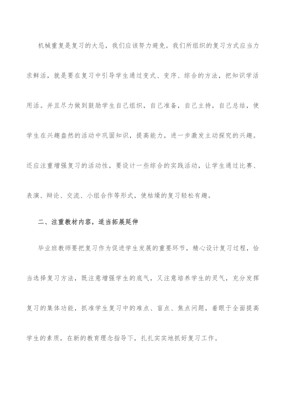 在教育工作毕业班老师会议上的发言各位领导,各位老师:大家好!作为一名小学六年级毕业班老师坐在这里和大家一起交流,我感觉到的不仅是一种荣耀,更多的是一份沉甸甸的责任。这份责任源于毕业班的重担,更源于新课改、新理念下如何教好学生的压力。毕业班是学校的窗口,教学质量的好坏直接影响到学校的声誉。我希望通过这样的活动让我们的老师凝心聚力,在领导的关怀下、在学校的支持下、在家长的配合下,团结协作、开拓创新,力争使毕业班的各项工作更上一层楼。下面我想就如何进行复习,如何抓住有限的时间让学生获得更多的知识掌握更多的技能,谈谈我自已几点肤浅的看法。一、提供心理支持、关注兴趣培养离考试越来越近,所有学生或多或少会有浮燥心里,会有考不好的担心和焦虑,会觉着累,学生的这些消极的心理需要得到释放和渲泄,作为老师,我们可以采用这样的方式为他们减压,譬如:个别面谈、小组交流、座谈会、班队活动等方式给予关注,以人为本,留心学生心理健康。同时,复习过程的组织方式是否灵活有趣直接影响到学生的学习情绪。教师如果只是一味地讲,不断地考,注入式的满堂灌,那学生就会觉着枯燥无味,自然就谈不上什么效果了。我们要不断变换教学方法,运用多种手段,把复习课上得象新授课那样精彩,那样耐人寻味。机械重复是复习的大忌,我们应该努力避免。我们所组织的复习方式应当力求鲜活,就是要在复习中引导学生通过变式、变序、综合的方法,把知识学活用活。并且尽力做到鼓励学生自己组织,自己准备,自己主持,自己总结,使学生在兴趣盎然的活动中巩固知识,提高能力,进一步激发主动探究的兴趣。还应注重增强复习的活动性,要设计一些综合的实践活动,让学生通过比赛、表演、辩论、交流、小组合作等形式,使枯燥的复习轻松有趣。二、注重教材内容,适当拓展延伸毕业班教师要把复习作为促进学生发展的重要环节,精心设计复习过程,恰当选择复习方法,既注意增强学生的底气,又注意培养学生的灵气,充分发挥复习的集体功能,抓准学生复习中的难点、盲点、焦点问题,着眼于全面提高学生的素质,在新的教育理念指导下,扎扎实实地抓好复习工作。以教材为本,通过复习,对教材的内容充分掌握,让学生做到温故而知新。我们可通过迁移重点训练项目,变换类型进行训练,将教材内容适当拓展,以激活知识的发展区,让学生得到知识的升华。三、抓住要点难点,切忌平均用力我认为对于毕业班的复习来说,应当各有侧重,抓住要害。重点、难点内容,进行强化。老师应注意复习的系统性,切忌平均用力。我们将通过分析近几年的毕业检测试题,认真搞好每个单元的检测,根据检测情况,分析教学中的得与失,组内教师共同商讨,查找学生学习中存在的问题,对有进步的学生多表扬和鼓励。四、加强家校联系,达成齐抓共管如果仅依靠教师的教和学生的学,往往不能取得预期的效果,因为学生家庭环境、个人素质都不尽相同,所以家长跟老师的密切配合不容忽视。我们通过召开毕业班家长会、个别交流、电话、短信、电子邮箱、qq等联系方式,加强与家长交流,向他们介绍当前的教育形势和我们的现实情况,就如何抓毕业班工作提出我们的设想,倾听他们对提出的宝贵意见,以达到齐抓共管的目的。我们坚信有各级领导的鼎力支持,有全体老师的团结奋斗,*中心小学这颗教育明珠必将更加璀璨夺目。一份春华,一份秋实,在教书育人的道路上我们付出的是汗水,然而我们收获的却是那一份份充实的沉甸甸的情感。我们用心去教诲每一个孩子,我们用情去培育每一个学生,我们无愧于我们的心,我们无悔于我们的事业。相信今日含苞欲放的花蕾,明日一定盛开绚丽的花朵。为了*镇的教育教学事业,让我们携手共进吧。谢谢大家。