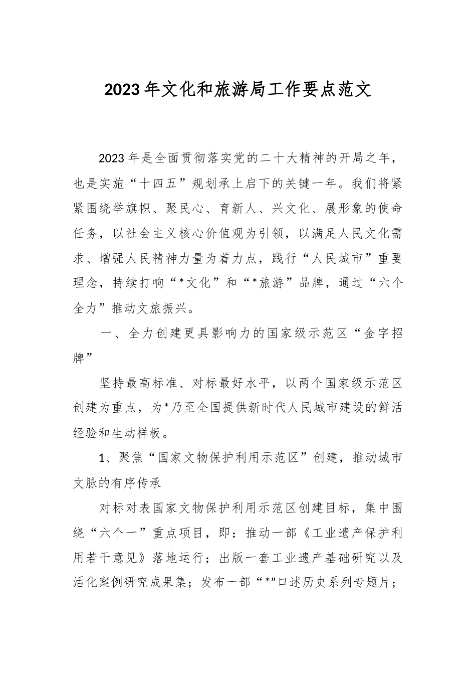 2023年文化和旅游局工作要点范文2023年是全面贯彻落实党的二十大精神的开局之年,也是实施“十四五”规划承上启下的关键一年。我们将紧紧围绕举旗帜、聚民心、育新人、兴文化、展形象的使命任务,以社会主义核心价值观为引领,以满足人民文化需求、增强人民精神力量为着力点,践行“人民城市”重要理念,持续打响“*文化”和“*旅游”品牌,通过“六个全力”推动文旅振兴。一、全力创建更具影响力的国家级示范区“金字招牌”坚持最高标准、对标最好水平,以两个国家级示范区创建为重点,为*乃至全国提供新时代人民城市建设的鲜活经验和生动样板。1、聚焦“国家文物保护利用示范区”创建,推动城市文脉的有序传承对标对表国家文物保护利用示范区创建目标,集中围绕“六个一”重点项目,即:推动一部《工业遗产保护利用若干意见》落地运行;出版一套工业遗产基础研究以及活化案例研究成果集;发布一部“*”口述历史系列专题片;加强*博物馆、*博物馆等一批示范性工程项目的引领;建立一个工业遗产档案微型展示馆,推动工业遗产原始档案数字化抢救;策划一场示范区创建论坛“文物和工业遗产保护利用”成果展。2、聚焦“国家级文化产业示范园区”创建,构建近悦远来的文创园区立足园区动漫游戏、网络视听、知识付费、云计算大数据等特色,打造主业突出、特色明显、集聚度强、在全国具有影响力的示范区。呈现网络视听行业蓬勃生机,举办2023年*网络视听季,通过行业企业交流、优秀内容展示、文创市集体验、主播探店打卡等方式,打造*成为“有活力、有魅力、有创意”的网络文化消费集聚地。推进大创智深入开展文旅部“文化产业园区携行计划”,与昆明相关园区展开合作,实现互利共赢。拓展文化内容植入,支持大创智公共服务平台、数字文化公园等植入文化项目,深化大创智区域文化活动品牌。二、全力塑造更具吸引力的人文精神气质以更高站位、更强合力加快塑造城市内外兼修、由内而外的人文精神之美,让城市有颜值更有气质。1、以重点品牌打造神韵内在美打造优质文化活动品牌。高水平办好*之春国际音乐节、*国际摄影节、*国际艺术节“艺术天空”版块、市民文化节等相关活动。依托区域特色,积极争取更多市级资源,推出叫得响、记得住的新品牌,为*量身打造品牌形象。打造“水岸联动”先行区域,结合文旅新热点、社会公众新关注,推动*游览码头从“交通型”向“功能型”转变,助推*区段*游船码头复航复苏,紧抓“初心启航·*红色文化游”推广运行的窗口期,深化打造具有*特色的“*游览”主题游产品。2、以文化地标赋能城区新形象配合市文物局、*博物馆积极推进长江口二号古船重大文博项目建设,努力打造具有世界影响力的*博物馆、全球一流水下考古的研究中心、国际航运贸易中心的展示窗口人民城市生活秀带的文化地标。推进中国近现代新闻出版博物馆正式开放,打造新闻出版业文献档案中心、文物修复中心、创新发布中心和文创展示中心。推进笔墨宫坊正式运营,使其成为具有一定社会影响的中华优秀传统文化教育活动基地。推进区图书馆*馆、区文化馆改扩建工程建设,打造多元化的新时代公共图书馆、公共文化会客厅,让文化设施全民共享。3、以生动宣传构建人文影响力深入挖掘区域特色。与人民网深入合作,优化“人民秀带直播间”栏目,宣传“人民城市”重要理念的文旅实践,讲好*故事。拓展文明宣传阵地。依托全国爱国主义教育基地国歌展示馆等文化阵地,高举“人民城市·文明先行”旗帜,扩大红色文化资源信息覆盖面。支持区图书馆争创全国文明单位。强化红色资源保护利用。不断挖掘区内革命文物以及红色场馆历史内涵和时代价值。用好红色文化资源,开展特色活动,吸引更多市民群众走进红色景点。推动多元融合的文艺精品创作。深挖“四个百年”的文化底蕴和资源禀赋,优化院团结对工作模式,立足*市群文新人新作展评展演等市级赛事,推动群众文化高质量创作。强化文联顶层建设,用好专业人士资源,团结全区文艺工作者开展文艺精品创作。三、全力描绘更具幸福感的文旅生活图景始终坚持以人民为中心的发展思想,推动文旅服务补短板、增供给、提效能、上水平,提高人民生活品质。1、打造有声有色...