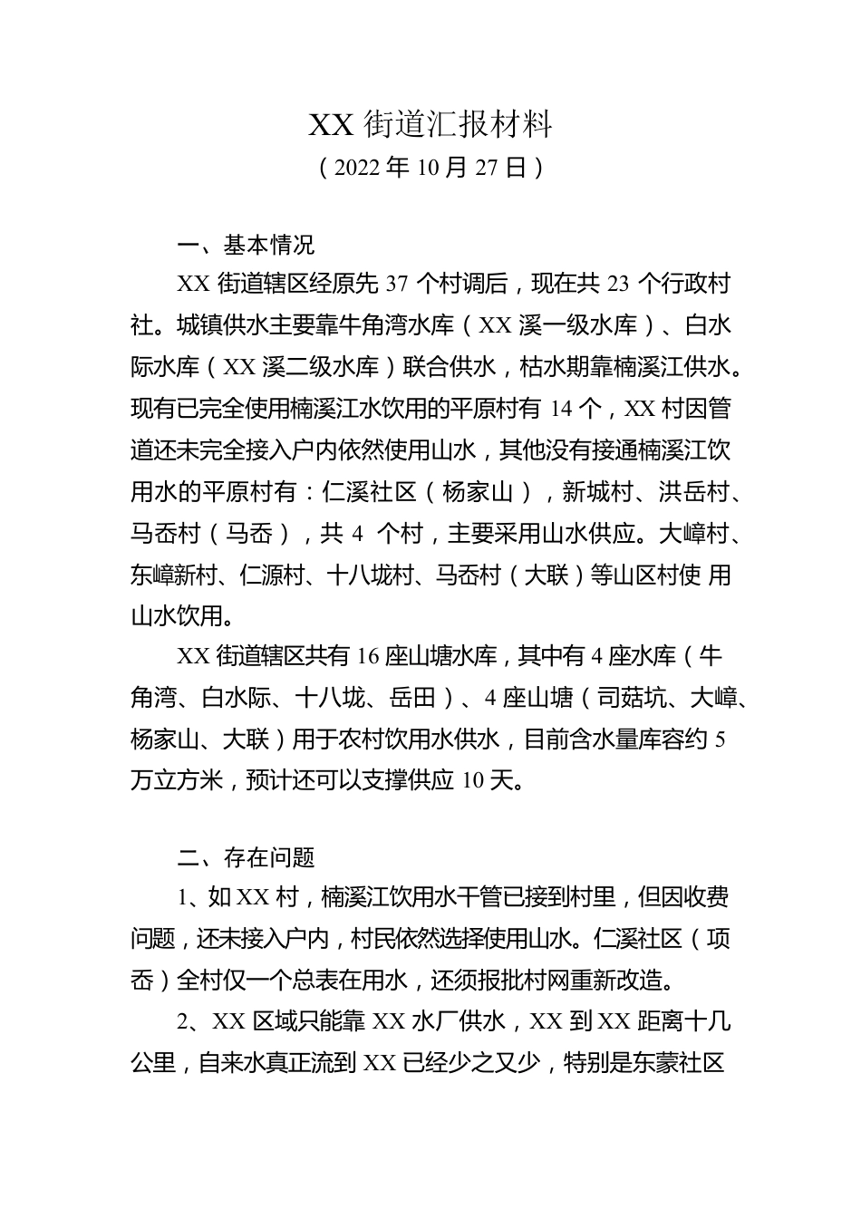XX街道汇报材料(2022年10月27日)一、基本情况XX街道辖区经原先37个村调后,现在共23个行政村社。城镇供水主要靠牛角湾水库(XX溪一级水库)、白水际水库(XX溪二级水库)联合供水,枯水期靠楠溪江供水。现有已完全使用楠溪江水饮用的平原村有14个,XX村因管道还未完全接入户内依然使用山水,其他没有接通楠溪江饮用水的平原村有:仁溪社区(杨家山),新城村、洪岳村、马岙村(马岙),共4个村,主要采用山水供应。大嶂村、东嶂新村、仁源村、十八垅村、马岙村(大联)等山区村使用山水饮用。XX街道辖区共有16座山塘水库,其中有4座水库(牛角湾、白水际、十八垅、岳田)、4座山塘(司菇坑、大嶂、杨家山、大联)用于农村饮用水供水,目前含水量库容约5万立方米,预计还可以支撑供应10天。二、存在问题1、如XX村,楠溪江饮用水干管已接到村里,但因收费问题,还未接入户内,村民依然选择使用山水。仁溪社区(项岙)全村仅一个总表在用水,还须报批村网重新改造。2、XX区域只能靠XX水厂供水,XX到XX距离十几公里,自来水真正流到XX已经少之又少,特别是东蒙社区等地势偏高平原村,水压严重不足、几乎无水可供。3、持续干旱情况下,山区村群众普遍生活用水已严重紧缺。三、工作建议1、下步动员未接入户内的平原村的群众积极落实最后10%的管道建设经费,确保全部19个全部平原村接通饮用楠溪江饮用水。2、积极寻找新水源,积极采购应急供水设备,建设应急抗旱工程来缓解生活饮用水的困境。截至目前,已采购各类水泵7台,水管、电缆等3800米以及其他配件,共计70098元。3、及时为饮水困难的山区村和地势偏高的平原村提供消防车应急供水服务。