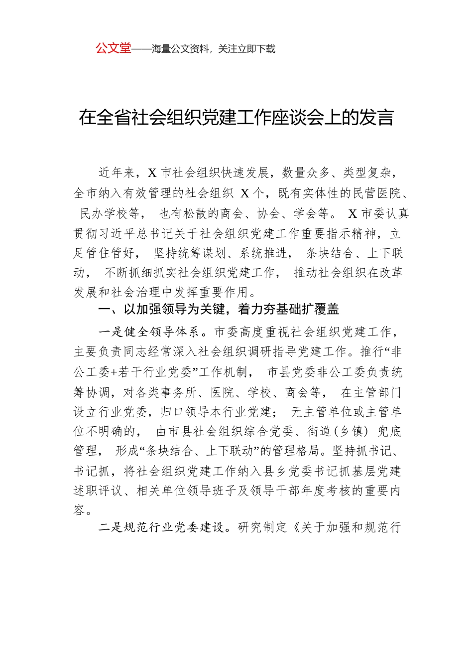 公文堂——海量公文资料,关注立即下载在全省社会组织党建工作座谈会上的发言近年来,X市社会组织快速发展,数量众多、类型复杂,全市纳入有效管理的社会组织X个,既有实体性的民营医院、民办学校等,也有松散的商会、协会、学会等。X市委认真贯彻习近平总书记关于社会组织党建工作重要指示精神,立足管住管好,坚持统筹谋划、系统推进,条块结合、上下联动,不断抓细抓实社会组织党建工作,推动社会组织在改革发展和社会治理中发挥重要作用。一、以加强领导为关键,着力夯基础扩覆盖一是健全领导体系。市委高度重视社会组织党建工作,主要负责同志经常深入社会组织调研指导党建工作。推行“非公工委+若干行业党委”工作机制,市县党委非公工委负责统筹协调,对各类事务所、医院、学校、商会等,在主管部门设立行业党委,归口领导本行业党建;无主管单位或主管单位不明确的,由市县社会组织综合党委、街道(乡镇)兜底管理,形成“条块结合、上下联动”的管理格局。坚持抓书记、书记抓,将社会组织党建工作纳入县乡党委书记抓基层党建述职评议、相关单位领导班子及领导干部年度考核的重要内容。二是规范行业党委建设。研究制定《关于加强和规范行业(综合)党委建设的意见(试行)》,对行业党委建设进行全方位规范,如明确行业(综合)党委设立流程,制发行业党建年度工作要点,制定党委工作规则、党委委员基层联系点制度,牵头推进行业党建工作标准化,定期向同级党委非公工委和上级行业党委专题汇报、进行年度述职等。三是扩大有效覆盖。健全完善与行业部门信息共享机制,开展“三项排查”动态掌握社会组织基本情况。上下联动抓好组建,有行业党委领导的实体性社会组织,由行业党委推进“两个覆盖”;党组织关系隶属地方的,属地党(工)委做好规范组建;在部分楼宇、孵化园设立党建工作站,统筹抓好区域内松散社会组织党建工作。严格落实税前列支、党费拨返等制度,推进党支部标准化规范化建设,不断提升有效覆盖质量。全市已组建社会组织党组织X家,覆盖X个社会组织。二、以融入中心为突破,着力抓结合强事业一是业务与党建同步谋划。推动主管部门“管业务”和“管党建”一体推进,做到“三个同步”,即社会组织与党组织建设同步登记审批、同步年检、同步评估。推动在行业评级、资金奖补、承接政府购买服务等工作中,依法依规将党建工作纳入评价体系。市县民政部门将《支持党建工作承诺书》、《新建社会组织党员情况表》纳入社会组织登记审批申报材料,党建工作情况在评估考核体系分值占X分。二是党建融入运行发展。推动市级行业协会在章程中写入建立党的组织、开展党的工作等内容,引导监督社会组织依法执业、诚信从业。市律师行业党委直接管理全市X家律师事务所,推动全部完成党建有关要求入章程,有关做法在全省律师行业党建工作座谈会作交流发言。针对一些协会、学会党员骨干组织关系未转入,按照“一方隶属、多方活动”原则,在市科技社团党委所属学术类社会组织领导层中建立X个工作小组,保证党员骨干参与决策管理、发挥作用。三是团结培育行业领军人才。通过社会组织党组织这个桥梁纽带,加强对领军人才的政策宣传和教育引导,积极发现和推荐优秀领军人才。目前,全市注册会计师、民办学校、民办医院等行业中,X%的负责人(合伙人)为党员;律师行业X名骨干律师担任全国、省、市、县“两代表一委员”;涌现出全国优秀教育工作者、X学校校长X,全国法律援助先进个人、X律师事务所主X,全国林业系统劳动模范、X苗木花卉经纪人协会会长X等杰出行业代表。三、以建强队伍为重点,着力选育管提本领一是配强带头人队伍。通过内部选、组织派、公开招等方式选优配强党组织书记,推行党组织与管理层双向进入、交叉任职,全市X%的社会组织党组织书记和负责人“一肩挑”。指导行业党委和县(市)区、开发区,采取集中培训、外出考察等方式强化教育培训,去年以来累计培训X人次。推行行业优秀党组织书记结对指导基础薄弱党组织,发挥帮带和孵化作用。X县组建民办学校“红领导师”团队,先进导师带培新组建党组织书记,带动能力水平整体提升。二是培优指导员队伍。从市级行业主管部门选派X人担任党...