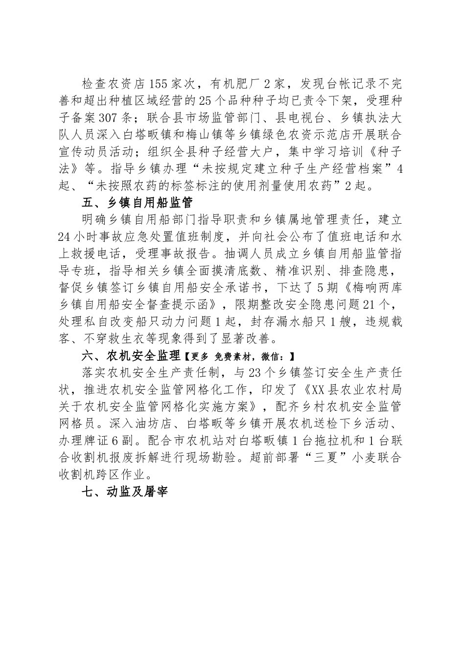 县县农业执法大队2023年上半年工作总结2023年,农业执法大队以贯彻学习习近平法治思想为契机,以推进农业农村法治化建设为目标,创新谋划渔业资源保护、农资打假、规范生猪屠宰、督导乡镇自用船监管、狠抓农业安全生产等工作,均取得了较好的成绩,现总结如下:一、行政执法情况至6月10日共出动执法人员1171人次,出动执法车辆523车次,检查经营场所360场次,已经立案8起,办结8起,涉案人员8人,罚款0.71万元。在“禁渔区、禁渔期”办理垂钓简易程序案件35起,罚款0.7万元。组织执法人员参加2023年全市农业综合行政执法大练兵暨大比武活动,大比武荣获团体第二名好成绩。组织8名同志参加市农业执法人员资格认证考试并全员通过。推进行政执法事项赋权乡镇工作,印制事项清单小册子1000份发放至相关执法人员,并深入相关乡镇联系赋权执法事项承接事宜。二、法治宣传情况印发《XX县农业农村局2023年全民国家安全教育日普法宣传活动方案》,印发《2023年XX县农业农村局普法依法治理工作要点》,组织开展了“3.15国际消费者权益日”法治宣传活动、“4.15”全民国家安全教育日普法宣传活动、“6.5”环境日宣传活动、“典亮村居.振兴乡村”主题普法宣传活动。完成安徽省事中事后综合监管系统的维护工作和“互联网+”系统的录入工作。组织人员参加习近平法治思想暨强化行政执法能力建设专题培训班。发布了《XX县人民政府关于梅响水库等重点水域禁渔的通告》(金政〔2023〕5号),在XX县融媒体中心有线电视黄金时段反复播放1周,同时在政府门户网站、养心XX、六安广播电视网等新媒体播报;出动宣传车170余车(船)次、张贴《禁渔通告》2000张、悬挂宣传标语16条、发放明白纸(一封信)800余份。广泛宣传禁渔有政策法规,确保禁渔期制度家喻户晓,人尽皆知。加大执法外宣,制作农业综合行政执法简报3期,广泛宣传禁渔、农资打假和生猪屠宰专项整治等工作,取得良好的社会效果。三、渔业资源保护情况指导XX海亮完成2023年两库鲢、鳙等鱼苗投放,指导企业依法护渔、文明护渔、安全护渔。组织渔政亮剑2023专项执法行动,推进“两库”禁渔及长江流域重点水域“十年禁捕”,开展打击“电捕鱼”等非法捕捞专项行动。组织农业、公安、市场监管、海事等部门和属地乡镇开展联勤执法,共开展巡查91次(联合巡查16次),出动执法车辆167辆次、执法船艇187艘次、执法人员540余人次,收缴违规网具41副、拆除钓台15个、驱离垂钓人员630余人次。配合天堂寨公安派出所查处涉嫌非法捕捞水产品刑事案件,提供网具和水产品认定书及相关证据材料。四、农资管理情况检查农资店155家次,有机肥厂2家,发现台帐记录不完善和超出种植区域经营的25个品种种子均已责令下架,受理种子备案307条;联合县市场监管部门、县电视台、乡镇执法大队人员深入白塔畈镇和梅山镇等乡镇绿色农资示范店开展联合宣传动员活动;组织全县种子经营大户,集中学习培训《种子法》等。指导乡镇办理“未按规定建立种子生产经营档案”4起、“未按照农药的标签标注的使用剂量使用农药”2起。五、乡镇自用船监管明确乡镇自用船部门指导职责和乡镇属地管理责任,建立24小时事故应急处置值班制度,并向社会公布了值班电话和水上救援电话,受理事故报告。抽调人员成立乡镇自用船监管指导专班,指导相关乡镇全面摸清底数、精准识别、排查隐患,督促乡镇签订乡镇自用船安全承诺书,下达了5期《梅响两库乡镇自用船安全督查提示函》,限期整改安全隐患问题21个,处理私自改变船只动力问题1起,封存漏水船只1艘,违规载客、不穿救生衣等现象得到了显著改善。六、农机安全监理【更多免费素材,微信:】落实农机安全生产责任制,与23个乡镇签订安全生产责任状,推进农机安全监管网格化工作,印发了《XX县农业农村局关于农机安全监管网格化实施方案》,配齐乡村农机安全监管网格员。深入油坊店、白塔畈等乡镇开展农机送检下乡活动、办理牌证6副。配合市农机站对白塔畈镇1台拖拉机和1台联合收割机报废拆解进行现场勘验。超前部署“三夏”小麦联合收割机跨区作业。七、动监及屠宰根据(六农牧〔2023〕3号)文件精神,组织开展为期3个月屠宰行业专项整治,组织...