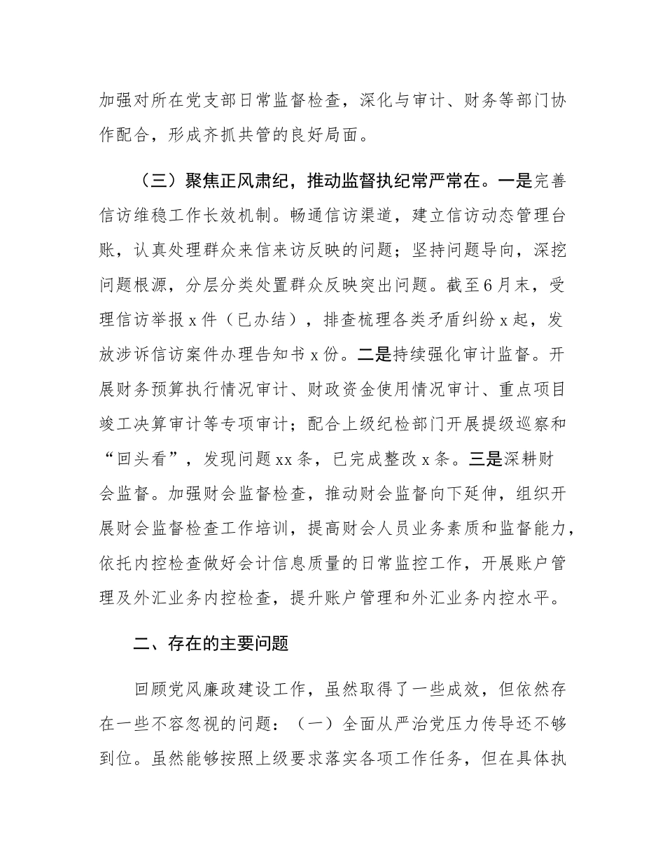 银行2024年度党风廉政建设工作总结xxxx年,我行坚持以新时代中国特色社会主义思想为指导,深入学习贯彻党的二十届三中全会和二十届中央纪委二次全会精神,认真落实上级部门和党委政府关于党风廉政建设和反腐败工作的决策部署,强化监督执纪问责力度,持之以恒正风肃纪,不断推动全面从严治党向纵深发展。现将我行2024年党风廉政建设工作情况总结如下。一、党风廉政建设工作情况(一)聚焦政治机关建设,筑牢思想基础。一是坚持“第一议题”和理论中心组学习制度。今年以来,共开展“第一议题”学习xx次,党组理论中心组集中学习次,专题研讨x次。二是抓好常见违纪违法问题专项治理。认真贯彻落实上级党组织部署要求,组织开展了违规吃喝整治、违规收送礼品礼金专项整治、网络借贷风险专项整治、防范非法集资宣传教育月活动等。截至x月末,针对日常监督检查发现的问题,全行通报批评相关人员xx人次。三是深入开展警示教育。制定下发《xxxx年廉洁高效建设警示教育月活动方案》,通过召开党风廉政大会、观看警示教育片、旁听庭审、现场参观警示教育基地等多种形式,扎实开展警示教育月活动。四是突出筑牢廉洁自律防线。制定下发《xxxx年廉洁高效建设廉洁自律“五个一”活动方案》,组织开展一次全面廉洁合规大检查、签订一份廉洁从业承诺书、开展一次基层廉情调研、开展一次廉洁高效建设宣讲、组织一次微视频评选活动。五是严肃党内政治生活。严格执行新形势下党内政治生活的若干准则,认真落实民主集中制原则,严格执行“三重一大”事项决策机制,确保党委各项决策落实落细落地。(二)聚焦全面从严治党,压紧压实责任。一是健全和完善相关工作机制。制定印发《XX市XX银行党委落实全面从严治党主体责任清单》《中共XX市XX银行委员会xxxx年党风廉政建设和反腐败工作要点》,进一步明确目标任务,压实工作责任;继续落实“抓系统、抓基层、抓主管”的工作思路,持续加强党的领导和党的建设工作。二是认真落实主体责任。成立党风廉政建设和反腐败工作协调小组,明确运作机制;党委书记认真履行第一职责,对重要工作做到亲自部署、重大问题亲自过问、重点环节亲自协调,其他班子成员落实“一岗双责”,抓好分管领域的党风廉政建设工作。三是强化监督协同。完善纪检监察体制机制,发挥派驻纪检监察组“探头”作用,加强对所在党支部日常监督检查,深化与审计、财务等部门协作配合,形成齐抓共管的良好局面。(三)聚焦正风肃纪,推动监督执纪常严常在。一是完善信访维稳工作长效机制。畅通信访渠道,建立信访动态管理台账,认真处理群众来信来访反映的问题;坚持问题导向,深挖问题根源,分层分类处置群众反映突出问题。截至6月末,受理信访举报x件(已办结),排查梳理各类矛盾纠纷x起,发放涉诉信访案件办理告知书x份。二是持续强化审计监督。开展财务预算执行情况审计、财政资金使用情况审计、重点项目竣工决算审计等专项审计;配合上级纪检部门开展提级巡察和“回头看”,发现问题xx条,已完成整改x条。三是深耕财会监督。加强财会监督检查,推动财会监督向下延伸,组织开展财会监督检查工作培训,提高财会人员业务素质和监督能力,依托内控检查做好会计信息质量的日常监控工作,开展账户管理及外汇业务内控检查,提升账户管理和外汇业务内控水平。二、存在的主要问题回顾党风廉政建设工作,虽然取得了一些成效,但依然存在一些不容忽视的问题:(一)全面从严治党压力传导还不够到位。虽然能够按照上级要求落实各项工作任务,但在具体执行过程中存在层层递减的现象,压力传导不到位;部分党员干部对党建管理应知应会知识点掌握不全面,在日常经营管理中放松了学习要求,对党的创新理论把握不到位、理解不深刻、运用不多,对党规党纪和企业规章制度学习不透彻、不严格、不规范。(二)重点领域廉洁风险较大。信贷业务方面,在贷款“三查”不尽职、不良贷款清收不力等方面还存在薄弱环节;理财业务方面,受市场竞争压力大、销售行为不规范等因素影响,仍存在违规销售非保本理财产品等情况;租赁业务方面,在租赁物跟踪管理上不够到位,租金收取不及时等问题仍然存在;授信管理方面,在...
