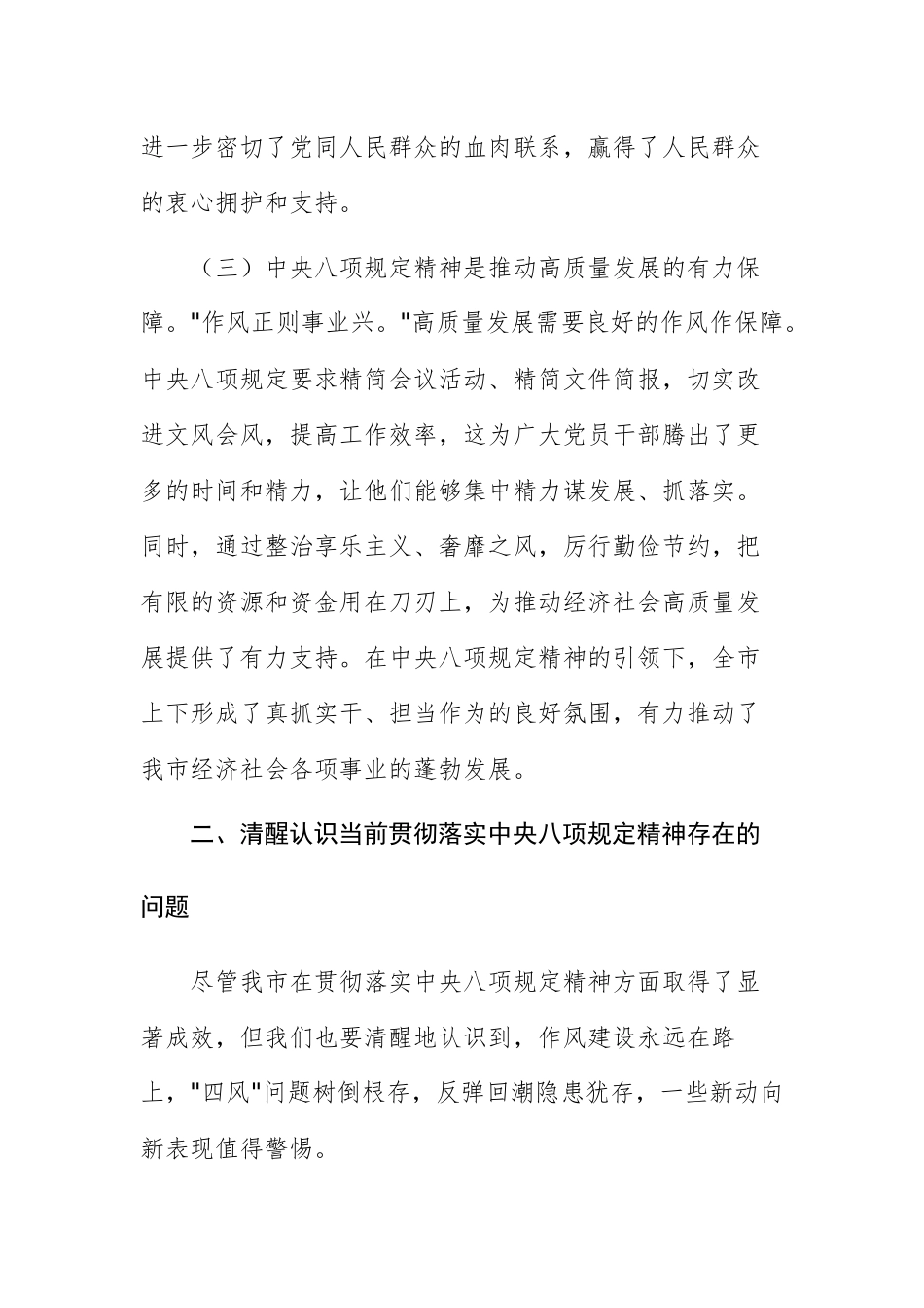 市委书记在理论学习中心组上关于学习贯彻xxx精神学习研讨发言材料同志们:党的作风就是党的形象,关系人心向背,关系党的生死存亡。2012年12月4日,中共中央政治局召开会议,审议通过了《中央政治局关于改进工作作风、密切联系群众的八项规定》,这是新时代中国共产党向人民群众作出的庄严承诺,是全面从严治党的重要开篇之作。十二年来,以习近平同志为核心的党中央以身作则、率先垂范,带领全党以抓铁有痕、踏石留印的坚韧和执着,持之以恒正风肃纪,推动党风政风为之一新,社风民风持续向上向善。在新的历史起点上,深入学习贯彻xxx精神,对于我们推进全面从严治党、加快建设现代化强市具有极其重要的意义。借此机会,我谈几点体会,以供同志们参考。一、深刻认识xxx精神的重大意义(一)xxx精神是全面从严治党的切入点。"欲事立,须是心立。"党的十八大之前,一些党员干部存在形式主义、官僚主义、享乐主义和奢靡之风等突出问题,严重侵蚀党的肌体,损害党在人民群众中的形象,人民群众深恶痛绝。xxx从调研、会议、文件、出访、警卫、报道、文稿、节俭等具体问题入手,以小切口推动大变革,从细微处发力,向实处使劲,从人民群众反映最强烈的作风问题抓起,开启了全面从严治党的新篇章。这一规定,体现了党中央坚持问题导向、直面现实问题的鲜明态度,彰显了党中央坚决反对"四风"、以作风建设开局破题的坚定决心,为全党树立了榜样,为全面从严治党奠定了坚实基础。(二)xxx精神是密切联系群众的重要纽带。"民之所忧,我必念之;民之所盼,我必行之。"我们党来自人民、植根人民、服务人民,一旦脱离群众,就会失去生命力。xxx把改进调查研究、密切联系群众放在首位,要求党员干部深入基层、深入群众,了解真实情况,解决实际问题。十二年来,广大党员干部积极践行xxx精神,走出办公室,走进田间地头、厂矿车间,与群众面对面交流、心贴心沟通,倾听群众呼声,关心群众疾苦,切实解决了一大批群众关心的热点难点问题,进一步密切了党同人民群众的血肉联系,赢得了人民群众的衷心拥护和支持。(三)xxx精神是推动高质量发展的有力保障。"作风正则事业兴。"高质量发展需要良好的作风作保障。xxx要求精简会议活动、精简文件简报,切实改进文风会风,提高工作效率,这为广大党员干部腾出了更多的时间和精力,让他们能够集中精力谋发展、抓落实。同时,通过整治享乐主义、奢靡之风,厉行勤俭节约,把有限的资源和资金用在刀刃上,为推动经济社会高质量发展提供了有力支持。在xxx精神的引领下,全市上下形成了真抓实干、担当作为的良好氛围,有力推动了我市经济社会各项事业的蓬勃发展。二、清醒认识当前贯彻落实xxx精神存在的问题尽管我市在贯彻落实xxx精神方面取得了显著成效,但我们也要清醒地认识到,作风建设永远在路上,"四风"问题树倒根存,反弹回潮隐患犹存,一些新动向新表现值得警惕。(一)形式主义、官僚主义问题仍未彻底根治。在贯彻党中央重大决策部署方面,个别部门和干部存在表态多调门高、行动少落实差的现象。比如,在推进乡村振兴战略中,个别地方只是简单地传达文件精神,没有结合本地实际制定切实可行的实施方案,导致工作进展缓慢,成效不明显。在履职尽责、服务经济社会发展方面,有的干部存在不担当、不作为、乱作为、假作为的问题。据统计,去年以来,我市因履职不力被问责的干部就有〔...〕人。在联系服务群众中,仍有个别干部消极应付、冷硬横推、效率低下。今年前〔...〕个月,我市"12345"政务服务热线接到关于干部服务态度差、办事效率低的投诉就有〔...〕件。文山会海反弹回潮的问题也不容忽视,一些部门仍然热衷于开会发文,以会议落实会议,以文件落实文件,据统计,今年上半年,全市印发的文件数量同比增长了〔...〕%,召开的会议次数同比增长了〔...〕%,给基层造成了严重负担。(二)享乐主义、奢靡之风问题禁而不绝。在违规收送名贵特产和礼品礼金方面,虽然明面上的违规行为得到了有效遏制,但一些隐形变异问题时有...