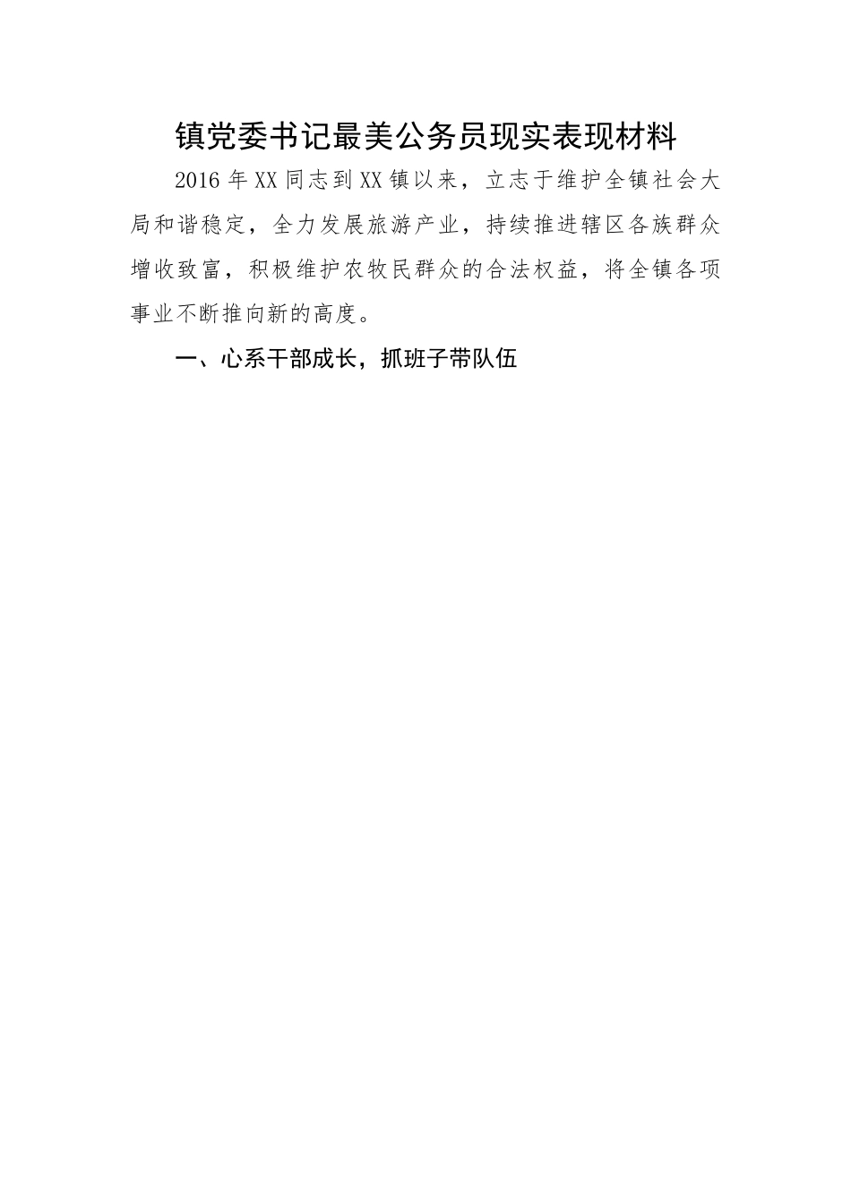 镇党委书记最美公务员现实表现材料2016年XX同志到XX镇以来,立志于维护全镇社会大局和谐稳定,全力发展旅游产业,持续推进辖区各族群众增收致富,积极维护农牧民群众的合法权益,将全镇各项事业不断推向新的高度。一、心系干部成长,抓班子带队伍“一个好的领导能带出一支好的队伍,一支好的队伍能创造出辉煌的业绩”,努力把班子建设成坚强有力的战斗集体,是XX同志工作的出发点和落脚点,也是作为XX镇党委书记义不容辞的责任。他坚持民主集中制,凡涉及到“三重一大”问题都提交镇党委会议研究决定,碰到各种问题都与班子成员一起研究解决,充分调动全体班子成员的工作积极性,有效增强班子成员整体合力。五年来,班子成员2名提拔为县级领导,1名提拔为正科,10名交流使用。他经常开展交流谈心活动,一方面进行工作交流,总结成绩,寻找差距,扬长避短,推动工作;另一方面他时常同机关干部谈心交流,他关心机关干部的日常生活和家庭困难,帮助解决力所能及的实际问题。在干部队伍管理上,他坚持用制度管人管事,不断修订完善干部请销假制度和责任分工制度,使每位干部人人肩上有担子,个个头上有责任,同时结合“两学一做”、党史学习教育等,实施“理论提升”工程,深入系统地学习党章党规、党史、脱贫攻坚等内容,学习习近平总书记系列讲话精神,使党员干部宗旨意识、政治意识、大局意识、核心意识、看齐意识进一步增强,镇党委班子驾驭全局、统揽发展、真抓实干、引领脱贫的能力进一步得到提升。二、心系发展大计,发展特色旅游XX镇气候适宜,冰雪旅游资源丰富。面对发展的新形势,XX同志带领镇党委一班人在广泛调研的基础上,坚持把产业结构调整和农业增效作为提高人民群众福祉、增加农民收入的根本任务和基础工程,着力打造以冰雪运动、采摘园、民宿、农牧家乐为主的旅游模式。举全镇之力推进XX工程项目建设,半个月时间征收拆迁建筑物30多万平米,并且实现“零强拆”、“零上访”。实施周边环境综合整治,拆除违建近7万平方,拆除五个村原干打垒温室近1000多座,腾出800多亩土地恢复大田经济。今年复耕近5万亩撂荒土地,增加收入500万元。将XX、XX、XX、XX有效衔接,全域旅游格局初显。种植观赏性经济作物近2万亩,不断优化“花海南山”的大田景观;逐步提升XX采摘园、XX牧民增收点基础设施水平,发展民宿81家,占全县54%;依托企业对XX、XX景区、4家滑雪场进行提档升级;引进企业发展旅游项目,将XX打造成为我镇新的旅游打卡地;配合县属相关部门成功承办了XX第十七届冰雪风情节、冰雪马拉松、少数民族传统体育赛事等活动。五年来,接待游客1638.2万人次,旅游收入达12.6亿元,在他的努力下,全镇旅游产业结构趋于合理,农牧民群众增收致富途径得到了有效拓展,工作成绩受到了各级领导的一致肯定。三、心系群众疾苦,办好事实事“权为民所用,利为民所谋,情为民所系”。作为XX镇党委书记的他,心中时刻想着群众,装着群众,急群众之所急,忧群众之所忧。他深刻认识到深挖旅游资源、提升巩固脱贫攻坚成果、进一步提升全镇公共服务水平是群众关心的热点难点问题。他根据实际情况,倾斜人力物力财力,狠抓薄弱环节建设。2016年以来,引进社会、企业投资累计达32亿元,超过前20年投资总和,新建道路28.3公里,修建道路42公里,对XX路、XX路、XX路实施道路拓宽、电网入地、景观提升。完成特色小镇周边道路建设及绿化、亮化工程项目,对沿街商业广告牌匾、建筑色彩、路灯、人行道铺装等设施进行改造,使XX镇发生了翻天覆地的变化。建设富民安居房共757套,发放补助资金4004万元,水冲式厕所普及率和污水处理率达94%。按照“村收集、镇清运、县转运”的要求,每日三次清运全镇各类垃圾,实行12小时保洁,教育引导村民自觉做好“院内院外六件事”,全镇村容镇貌和居住环境得到极大的改善和提升。XX同志紧紧围绕自治区党委“九大惠民工程”和市委“十件民生实事”,5年间来申请资金新建5所幼儿园,让全镇学龄前儿童达到“应入尽入”。举办群众性文化活动千余场次,极大的丰富了农牧民群众的业余生活。发动、引导群众参与每年一次全民健康体检工程。城乡居民养老保险参保率达98...