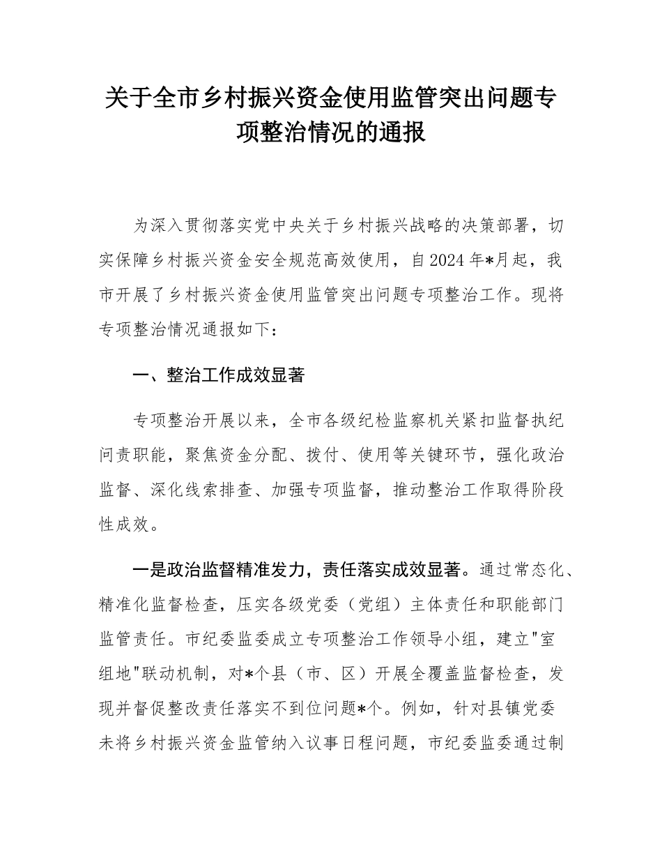 关于全市乡村振兴资金使用监管突出问题专项整治情况的通报为深入贯彻落实党中央关于乡村振兴战略的决策部署,切实保障乡村振兴资金安全规范高效使用,自2024年*月起,我市开展了乡村振兴资金使用监管突出问题专项整治工作。现将专项整治情况通报如下:一、整治工作成效显著专项整治开展以来,全市各级纪检监察机关紧扣监督执纪问责职能,聚焦资金分配、拨付、使用等关键环节,强化政治监督、深化线索排查、加强专项监督,推动整治工作取得阶段性成效。一是政治监督精准发力,责任落实成效显著。通过常态化、精准化监督检查,压实各级党委(党组)主体责任和职能部门监管责任。市纪委监委成立专项整治工作领导小组,建立"室组地"联动机制,对*个县(市、区)开展全覆盖监督检查,发现并督促整改责任落实不到位问题*个。例如,针对县镇党委未将乡村振兴资金监管纳入议事日程问题,市纪委监委通过制发监察建议书,推动该镇建立资金使用定期研究机制,完善项目审批流程,确保资金管理责任到人。二是线索排查深挖细查,违纪违法问题有效遏制。拓宽线索来源渠道,通过群众举报、巡察审计、大数据比对等方式,共收集问题线索*条,立案查处*件,处理*人,其中党纪政务处分*人,移送司法机关*人。典型案例包括:县镇财政所原工作人员张某利用职务便利,通过虚增工程量套取产业扶持资金*万元,用于个人挥霍;区村党支部书记李某在危房改造资金分配中优亲厚友,违规为亲属申领补助*万元,被给予开除党籍处分。这些案件的查处,形成了强大震慑,释放了越往后执纪越严的强烈信号。三是专项监督靶向施治,资金使用更加规范。聚焦产业发展、基础设施建设等重点领域,开展专项监督检查*次,发现并整改资金分配不合理、拨付不及时、使用不规范等问题*个。例如,针对县镇*个产业项目资金滞留闲置问题,市纪委监委督促财政部门建立资金拨付"绿色通道",推动*万元资金及时到位,项目提前*个月建成投产,带动周边农户年均增收*万元。同时,通过"四不两直"方式走访群众*人次,发现并纠正*起虚报冒领、截留挪用问题,切实维护了群众利益。二、存在的突出问题尽管专项整治取得了一定成效,但仍存在一些突出问题,主要表现在以下三个方面:一是责任落实存在短板。部分党委(党组)对乡村振兴资金监管重视不够,主体责任压得不实。例如,县局未履行监管职责,对下属单位资金使用情况失察,导致*万元生态保护资金被挪用用于办公开支。个别党员干部履职不力,如镇村村委会主任王某在项目验收中弄虚作假,致使*万元基础设施建设资金被虚套。二是资金管理存在漏洞。资金分配不科学、拨付不及时、使用不透明等问题仍然存在。审计发现,区在产业项目资金分配中存在"撒胡椒面"现象,*个项目平均投资不足*万元,难以形成规模效应。部分项目资金滞留闲置,如县*个基础设施项目因前期手续不全,导致*万元资金滞留超过*个月。此外,还存在资金使用不规范问题,如镇将*万元产业扶持资金用于偿还村级债务。三是制度执行存在偏差。部分单位制度执行不到位,存在打折扣、搞变通现象。例如,县未严格执行资金审批程序,*个项目未经集体研究擅自变更资金用途。基层财务人员专业素质薄弱,如镇财政所会计李某因业务能力不足,导致*笔资金账目混乱,审计调账工作量占比达*%。个别地方还存在制度形同虚设问题,如村未建立资金使用台账,无法追溯资金流向。三、下步工作建议针对上述问题,全市各级各部门要坚持问题导向,举一反三、标本兼治,持续深化专项整治,确保乡村振兴资金安全高效使用。一是强化政治担当,压实"两个责任"。各级党委(党组)要提高政治站位,将乡村振兴资金监管纳入全面从严治党主体责任清单,定期研究部署、定期督促检查。纪检监察机关要强化政治监督,紧盯党委(党组)主体责任、职能部门监管责任和党员干部履职尽责情况,对责任落实不到位的严肃问责。要建立"一案双查"机制,既追究直接责任人责任,又倒查相关领导责任,以强有力的问责倒逼责任落实。二是健全监管机制,规范资金管理。财政、农业农村等职能部门要加强协作配合,建立健全资金分配、拨付、使用全流程监管机制。要优化资金分配方式,突出重点...