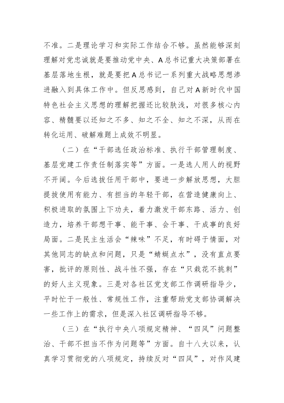 Xx乡镇党委书记关于巡视整改专题民主生活会的对照检查材料按照本次民主生活会的具体要求,我深入学习了A新时代中国特色社会主义思想和党的二十大精神以及A总书记关于巡视工作的一系列重要指示精神,认真学习省委巡视组关于巡视区巡视情况的反馈意见,省委巡视工作领导小组成员、巡视办副主任在反馈会议上的讲话和市委常委区委书记的表态讲话精神。会前,我广泛征求了领导班子和党员干部的意见建议,对照省委巡视反馈意见,深入查摆问题、剖析根源,明确了整改方向和整改措施。现将个人对照检查情况报告如下:一、存在的问题对照省委巡视组反馈的意见,我逐条梳理、深刻查摆发现自身主要存在以下六个方面问题。(一)在“思想建设标准、贯彻落实中央和省委决策部署、民主集中制执行等”方面。一是因为工作繁忙,除参加集中学习外,很少主动自学,学习的主动性和自觉性不强,订购的报刊杂志,堆积在办公室,因时间原因很少翻阅,存在以会代学、以会代训的现象。对A总书记关于治国理政的新思想、新论断满足于现学现用、即用即学,缺少深度和广度,致使自己对新知识、新政策掌握不够、理解不透、把握不准。二是理论学习和实际工作结合不够。虽然能够深刻理解对党忠诚就是要推动党中央、A总书记重大决策部署在基层落地生根,就是要把A总书记一系列重大战略思想渗进融入到具体工作中。但反思感到,自己对A新时代中国特色社会主义思想的理解把握还比较肤浅,对很多核心内容、精髓要以还知之不多、知之不全、知之不深,从而在转化运用、破解难题上成效不明显。(二)在“干部选任政治标准、执行干部管理制度、基层党建工作责任制落实等”方面。一是选人用人的视野不开阔。今后选拔任用干部中,要进一步解放思想,大胆提拔使用有能力、有担当的年轻干部,在营造健康向上、积极进取的氛围上下功夫,着力激发干部东路、活力、创造力,培养干部想干事、能干事、会干事、干成事的良好局面。二是民主生活会“辣味”不足,有时碍于情面,对其他同志的缺点和问题,只是“蜻蜒点水”,没有直点要害,批评的原则性、战斗性不强,存在“只栽花不挑刺”的好人主义现象。三是对各社区党支部工作调研指导少,平时忙于一般性、常规性工作,注重帮助党支部协调解决一些工作上的需求,但是深入社区调研指导不够。(三)在“执行中央八项规定精神、“四风”问题整治、干部不担当不作为问题等”方面。自十八大以来,认真学习贯彻党的八项规定,持续反对“四风”,对作风建设的重要性认识持续增强,作风建设有了很大提高,对照新形势新任务新要求,仍存在一些不容忽视的问题。一是工作中深入社区调查研究不够,没有掌握第一手资料,了解面上情况多,发现深层次问题少。二是在联系群众方面,与群众见面,针对性、目的性的多,真正与群众沟通思想的少;对于群众的呼声和诉求,特别难以解决的人和事,有时思想上有嫌麻烦的倾向,向上级反映得不够,没能站在群众的利益上想问题,解决具体情况和困难的情况少。三是虽然能较好落实中央八项规定精神,但以上率下的作用还没有充分发挥;对“四风”隐身变形、花样翻新等问题,抵触不够,批评不够,反击不够。(四)在“主体责任落实、监督执纪问责等”方面。一是作为党委书记,履行全面从严治党主体责任还不到位对党风廉政建设要求不严、标准不高、抓得不够,对上级布置和要求的党风廉政建设各项工作只是在会议上传达,讲几句口号,说几句狠话。二是对班子成员履行“一岗双责”的监督提醒不经常,开展的廉政教育活动较少,教育方式比较简单,广泛互动、相互启发、反面警示、正向引导等方式结合不够,廉政约谈的次数和质量有待提高。(五)在“项目建设、财政资金监管、行政执法等”方面。一是对财务管理人员重视程度不高。对财务管理人员的财经法律法规和业务知识学习培训不够。工作人员只是承担了会计核算和资金支付等简单的服务性工作,对具体的业务和决策了解的不多,对各活动的事前和事中的辅助作用没有体现出来。二是财政资金的使用监管力度不够。财政资金点多面广,项目繁多,资金量大,使用分散,管理难度较大。对财政资金管理粗放,未进行细化,没有形成科学的财...