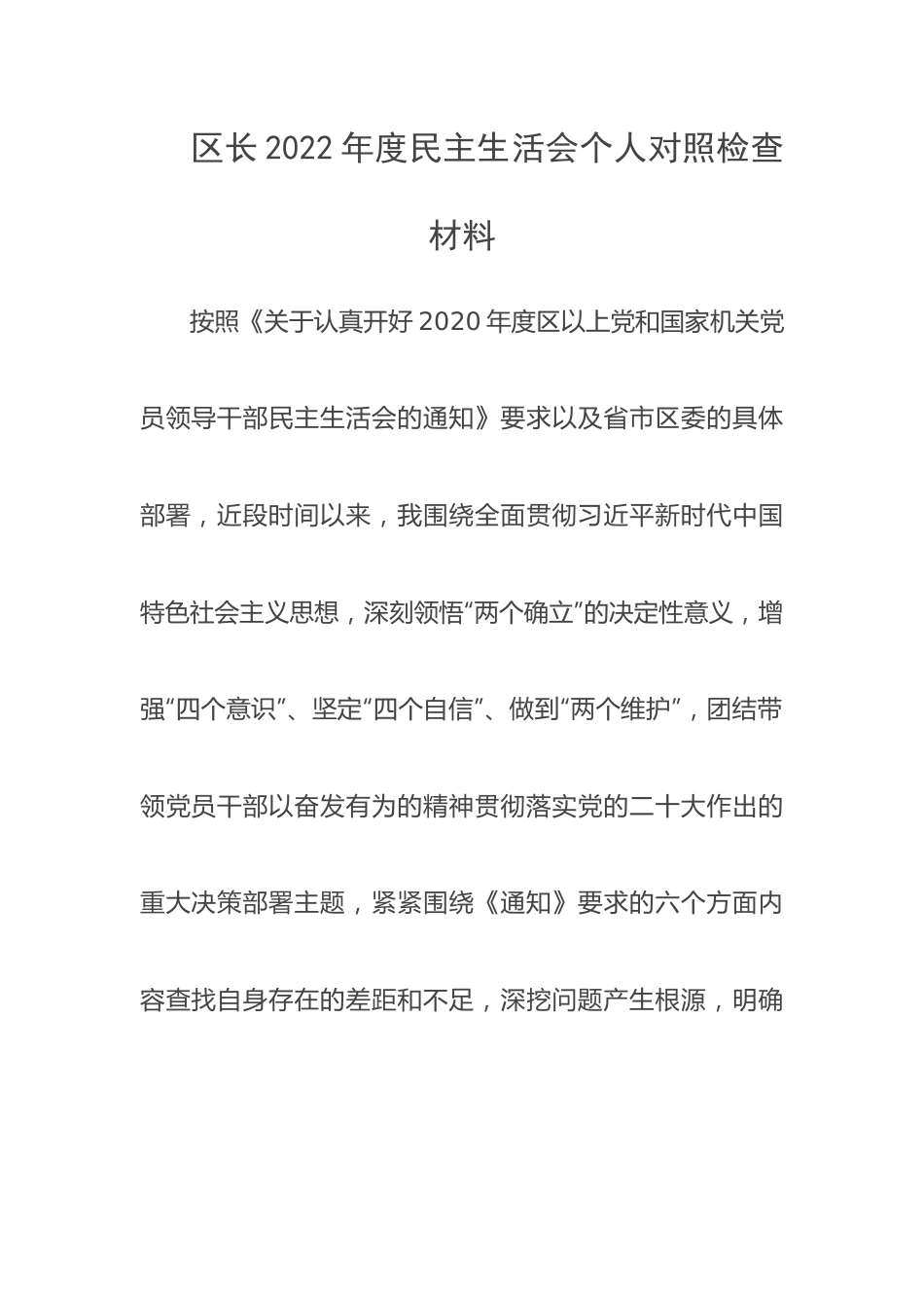 区长2022年度民主生活会个人对照检查材料按照《关于认真开好2020年度区以上党和国家机关党员领导干部民主生活会的通知》要求以及省市区委的具体部署,近段时间以来,我围绕全面贯彻习近平新时代中国特色社会主义思想,深刻领悟“两个确立”的决定性意义,增强“四个意识”、坚定“四个自信”、做到“两个维护”,团结带领党员干部以奋发有为的精神贯彻落实党的二十大作出的重大决策部署主题,紧紧围绕《通知》要求的六个方面内容查找自身存在的差距和不足,深挖问题产生根源,明确了今后努力方向和整改措施,现将个人对照检查情况报告如下。一、存在的问题(一)在深刻领悟学习贯彻党的二十大精神的重大意义,带头全面学习、全面把握、全面落实方面。近段时间能够经常学习党的二十大精神,积极参与理论学习中心组学习,带头开展个人自学,切实把学习贯彻党的二十大精神作为当前的首要任务和头等大事,推动全面学习、全面领会。但深入反思还存在学用脱节的问题一是融汇贯通不够。学用结合方面做的还不够好,对学习成果如何结合本地实际更好落实思考不够,没能做到融会贯通。二是指导工作不够。坚持用以指导实践、推动工作做的还不够好。在研究谋划2023年工作思路过程中,没能充分结合上级精神,在创新举措方面还不够大胆、没有跳出一时一事的圈子,致使思路初稿效果不够理想。(二)在深刻领悟“两个确立”的决定性意义,进一步增强做到“两个维护”的思想自觉、政治自觉、行动自觉方面。能够深刻领悟“两个确立”的决定性意义,带头增强“四个意识”、坚定“四个自信”、做到“两个维护”,坚决执行党委的重要指示和决策部署,但在具体贯彻落实上还存在一定“时差”问题。一是学习思考不深。对理论知识创立的背景、作用、影响等理解浅尝辄止。通过学习,认识度有所增强,但领悟力、判断力仍然不足,没能做到潜心研究、全面领会。二是转化不够及时。对个别新理论、新政策从学习领会到自身消化再到自觉执行有时需要的时间和过程稍长,在贯彻落实上未能做到从快、从优,导致个别工作任务执行不够及时到位。比如:在推进**建设过程中,由于对新领域、新问题整体思路和专业知识掌握不足,未能在工作进度上取得实质性突破。二是落实不够有力。(三)在深刻领悟习近平新时代中国特色社会主义思想的长远指导意义,切实用以武装头脑、指导实践、推动工作方面。虽然能够自觉在思想上、政治上、行动上同以习近平同志为核心的党中央保持高度一致,但客观来讲,还存在一些问题。一是学习不够经常。政治理论学习未能常态化坚持,日常除了积极参加区委、政府班子例行学习外,很难静下心来研读党的基本知识、基本理论方面书籍,没有做到学习与工作“两手抓”,没有做到对理论进行系统研究、深刻领会。二是落实不够迅速。具体工作中,有时考虑的客观因素过多,反复研究考量,抓落实的时效性还不够。对群众接受程度高、推行阻力小的工作就执行得快一些,反之对一些难度较大的工作就执行得相对慢一些。(四)在深刻领悟全面推进中国式现代化的中国特色、本质要求、重大原则和社会主义现代化建设战略部署,面对艰巨繁重任务和风险挑战,敢于斗争、担当作为,为党履职、为民尽责方面。能够紧紧围绕区委、区政府的决策部署,严格落实疫情防控和经济社会发展各项工作要求,主动承担急难险重任务,坚决不回避矛盾,但有时对工作过程和完成效果督促、检查还不够,导致对个别工作进展情况还不完全掌握、工作成效还不完全了解,对出现的问题没能够及时发现和解决。一是深入基层调研还不够。在办公室待的时间较多,到基层调研时间较少,没能做到定期了解基层情况,导致有些工作推进考虑基层实际不够。二是担当作为还有差距。工作略显保守,对有些棘手问题有畏难情绪,处理信访矛盾缺乏方式方法。(五)在深刻领悟领导干部在全面从严治党上的风向标作用,严于自我革命,自觉在遵规守纪上为全党作表率方面。能够带头坚持全面从严治党,勇于自我革命,认真开展批评和自我批评。但有时还存在一些不足。一是存在好人主义思想,开展相互批评方面做的还不够好,有时还有顾忌,怕得罪人。二是规矩意识还不够高。能够注重...