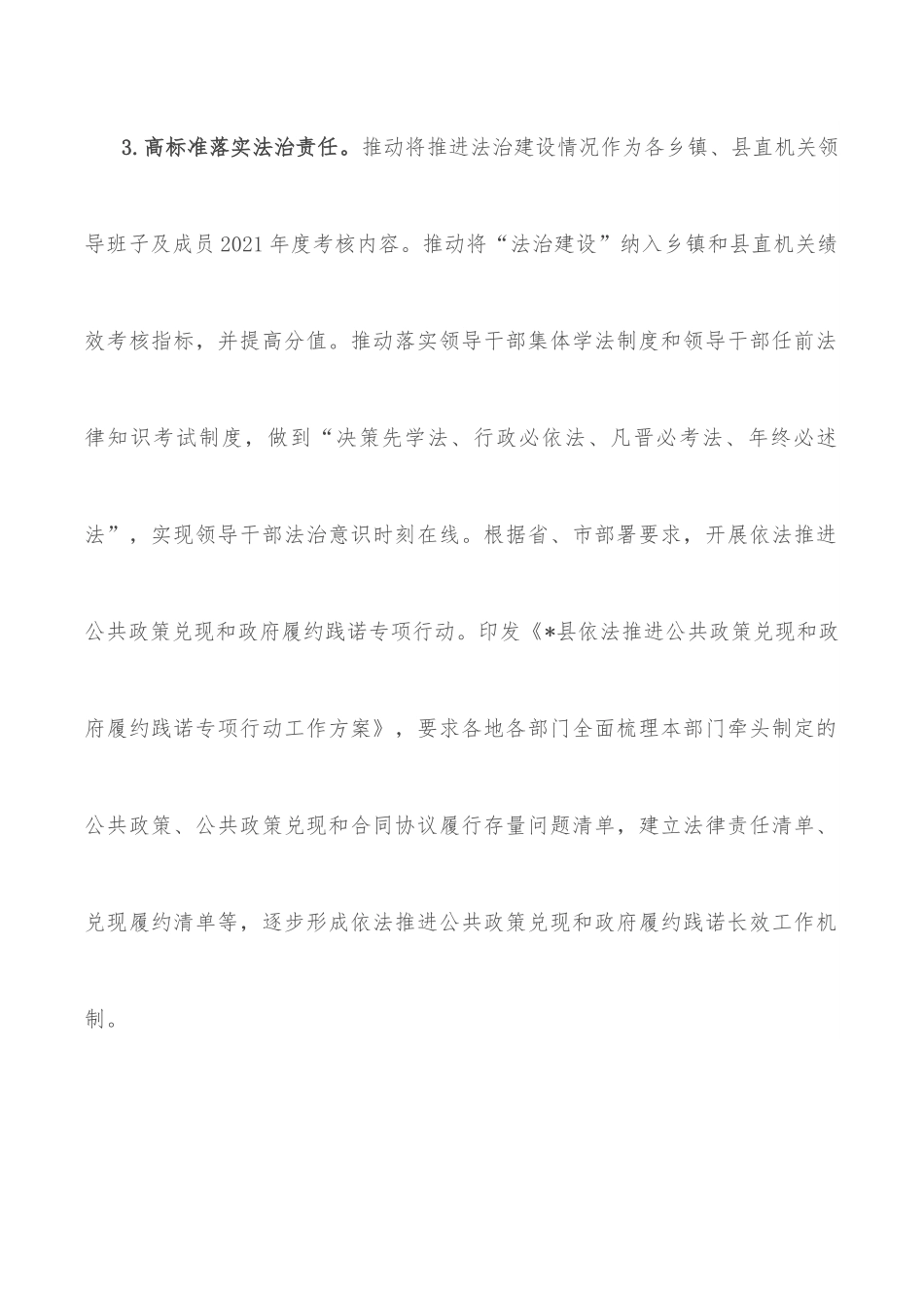 县司法局2022年度上半年普法与依法治理工作总结一、工作开展情况(一)全面依法治县工作稳步推进1.高站位坚持政治引领。深入学习习近平法治思想,在全县范围内开展《习近平法治思想学习纲要》学习活动,组织全县干部参加“深入学习贯彻习近平法治思想”网络专题班。推动将习近平法治思想列入2022年县委理论学习中心组年度学习计划和全县干部教育培训计划多个主体班次。2.高水平谋划法治建设。草拟全面依法治县年度工作要点并征求意见,推动召开县委依法治县办公室会议,研究谋划法治建设领域相关事宜,谋划开展2021年度专题述法评议工作,积极发挥县委依法治县办公室在法治建设方面的参谋助手、统筹协调、督促落实作用。3.高标准落实法治责任。推动将推进法治建设情况作为各乡镇、县直机关领导班子及成员2021年度考核内容。推动将“法治建设”纳入乡镇和县直机关绩效考核指标,并提高分值。推动落实领导干部集体学法制度和领导干部任前法律知识考试制度,做到“决策先学法、行政必依法、凡晋必考法、年终必述法”,实现领导干部法治意识时刻在线。根据省、市部署要求,开展依法推进公共政策兑现和政府履约践诺专项行动。印发《*县依法推进公共政策兑现和政府履约践诺专项行动工作方案》,要求各地各部门全面梳理本部门牵头制定的公共政策、公共政策兑现和合同协议履行存量问题清单,建立法律责任清单、兑现履约清单等,逐步形成依法推进公共政策兑现和政府履约践诺长效工作机制。4.高质量推进督察整改。扎实推进中央依法治国办对*省开展法治政府建设实地督察反馈意见的整改工作,及时草拟《*县法治政府建设实地督察反馈意见的整改工作方案》及指引清单细则,面向全县各单位征求意见。根据各单位意见修改完善后,形成《*县法治政府建设实地督察反馈意见的整改工作方案》,要求全县各地各单位对照反馈意见举一反三,逐条整改,逐一销号。组织召开**县法治政府建设实地督察反馈意见整改工作推进会,对全县法治政府建设实地督察反馈意见整改工作进行推进部署。(二)普法依法治理工作亮点纷呈1.做精普法宣传。深入开展“八五”普法,压实“谁执法谁普法”落实普法责任制。出台《2022年*县普法依法治理工作要点》和《*县2022年度法治宣传教育工作重点单位普法责任清单》,细化明确全县各单位普法职责,构建多部门联动普法、实现齐抓共管的法治宣传网络。加大全民普法力度,全面落实“法律六进”要求,利用春节、“3.15”国际消费者权益日、“4.15”全民国家安全教育日、民法典宣传月等重要时间节点,动员全县普法力量,将习近平法治思想和宪法法律法规作为普法重点内容,大力开展各种形式的普法活动70余场次。因时因地打造“普法小院”“普法小摊”“大鼓书普法”“板凳普法队”等普法品牌,围绕群众所思所惑的法律问题开展精准普法,以农家庭院、田间地头、房前屋后为普法场所,既接地气又有人气,受到省市肯定,并被国家级媒体宣传报道。利用新媒体传播优势,在“**司法行政在线”微信公众号开辟普法专栏,并创作了“**说法”“**说快板”等形式的普法音频节目,搭建线上普法平台,拓宽普法宣传的传播面,引导和促进群众办事依法、遇事找法、解决问题用法、化解矛盾靠法。2.做大普法队伍。继续实施农村“法律明白人”培养工程,指导督促各乡镇组织开展“法律明白人”培训,进一步提高农村普法骨干、法律明白人的法律知识水平和依法处事能力,充分发挥其在提高农民法治素养、维护农民合法权益、预防和化解农村社会矛盾、促进“三治融合”中的示范引领作用。目前,全县共培养法律明白人4883人。在各单位推荐的基础上,从各乡镇、党政机关、各企事业单位中聘请33名专业人士组建县“八五”普法志愿者队伍,全方位、常态化开展法治宣讲活动。3.做优法治文化。按照因地制宜、资源整合、简易适用的要求,结合美丽乡村公共服务设施建设,持续推动法治文化共建共享,打造合事点、普法小院、法治广场、法治长廊等普法阵地,并定期依托各普法阵地开展法治宣传或法治文化活动,利用通俗易懂的文字图片讲述与群众日常生活相关的法律常识,让法治思维深入人心。结合乡村春晚、“送戏下乡”等活动,引...