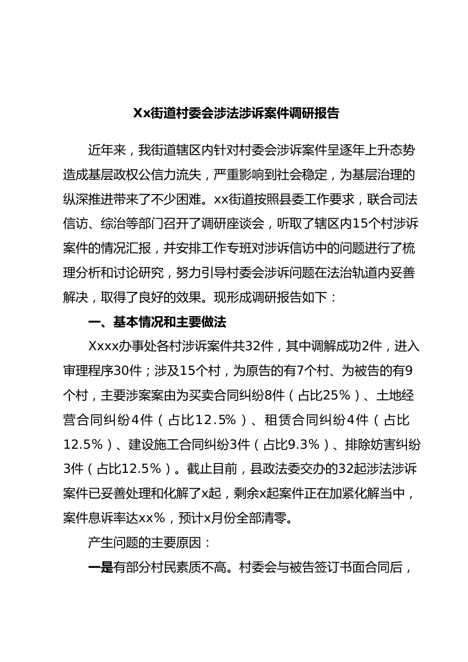 Xx街道村委会涉法涉诉案件调研报告近年来,我街道辖区内针对村委会涉诉案件呈逐年上升态势造成基层政权公信力流失,严重影响到社会稳定,为基层治理的纵深推进带来了不少困难。xx街道按照县委工作要求,联合司法信访、综治等部门召开了调研座谈会,听取了辖区内15个村涉诉案件的情况汇报,并安排工作专班对涉诉信访中的问题进行了梳理分析和讨论研究,努力引导村委会涉诉问题在法治轨道内妥善解决,取得了良好的效果。现形成调研报告如下:一、基本情况和主要做法Xxxx办事处各村涉诉案件共32件,其中调解成功2件,进入审理程序30件;涉及15个村,为原告的有7个村、为被告的有9个村,主要涉案案由为买卖合同纠纷8件(占比25%)、土地经营合同纠纷4件(占比12.5%)、租赁合同纠纷4件(占比12.5%)、建设施工合同纠纷3件(占比9.3%)、排除妨害纠纷3件(占比12.5%)。截止目前,县政法委交办的32起涉法涉诉案件已妥善处理和化解了x起,剩余x起案件正在加紧化解当中,案件息诉率达xx%,预计x月份全部清零。产生问题的主要原因:一是有部分村民素质不高。村委会与被告签订书面合同后,部分村民不履行义务,或对村级管理有异议,相关费用该交而不交且态度恶劣,常年拖、赖、欠,村委会多次通知被告并协调处理无果,忍无可忍只能通过法律程序寻求解决。Xx村3件及xx村4件涉诉问题,均由村民签订合同而不履行义务所导致。还有部分村民以土地侵占、设置障碍等各种方式,占有村集体财产或损害村集体利益,妨碍村委工作正常开展,其根本原因在于部分村民素质不高。二是村干部法律意识淡薄。部分合同内容不完善,还存在流转土地四至不清、对到期后的地上附着物处理约定不明确、没有确定违约责任划分等情况,极易引起不必要的纠纷。部分资产资源的处置双方未签订书面合同,仅有口头约定,造成履约困难。以xx村为例,该村将土地承包至原告并签订合同,后因经营问题原告提出更换承包人,前张村委口头答应后将承包费退还至原告但未签订协议,后原告钻空子以造成损失为由起诉xx村单方面毁约,经法院判决,决定冻结该村经济合作社帐户,赔偿原告损失究其深层次原因,是村干部对法律知识的不熟悉,程序上的不了解,造成了集体资产流失,损害了集体成员的利益。三是村集体履行合同困难。近年来乡村振兴、人居环境整治等战略的实施,以村为主体的农村建设方兴未艾,各村都投入了大量人力、物力、财力支持,但仍有部分村没有结合自身实际情况,在面对本村资源匮乏、经济困难、增收乏力等问题的情况下却依然签订了大量租赁合同和建设工程合同,并未考虑村集体收入承受能力,只是盲目签订合同,待到履行合同时,村经济合作社帐户余额不足无法支付款项,不能及时履行合同导致违约,损害了合同相对方利益并因此产生纠纷。以xx村建设工程施工合同纠纷为例,该村村集体经济薄弱且增收乏力,建设该村村委会与小广场时与原告签订金额为8万余元的大额土方供应合同,现因该村经济困难暂时无力偿还。主要做法:辖区内村委会涉诉案件总体分为三个类别:一是案情简单,经协调可以撤诉结案。二是案情复杂,需多部门联合处理。三是已经判决,处理结果合情合法,但当事人主观不同意,仍要继续上诉。面对不同的情况xx街道分类施策、精准化解。针对第一种情况,我们聚焦网格化管理,在社区、新村打造特色调解室,整合签约律师、新村干部、老党员、网格员、巾帼志愿者等多元力量利用金牌调解员队伍,积极开展源头预防、排查梳理、纠纷化解为群众提供优质服务,快速处理简单案件,促使矛盾纠纷在一线解决。针对第二种情况,我们在街道层面依托综治中心,设立“一站式”矛盾纠纷调解窗口,按照“前台受理、后台分流”的工作思路在受理复杂案件后,由相关联动部门负责协调上下级单位,并定时进行信息汇总,最后出方案、定政策,形成部门合力,切实解决复杂案情,以达到诉前化解的工作目标。针对第三种情况,我们严格落实“领导包案”工作机制,对暂时无法化解的矛盾纠纷,由包村科级干部包案,安排专人负责跟踪处理,量身定制解决方案,做到“一案一策”,同时整合信访力量,定期对当事人进行沟通疏导、情绪稳控,依法正确...